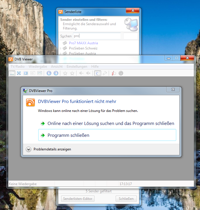 BenneX Posted March 14, 2016 Posted March 14, 2016 (edited) Hallo Leute, seit dem Update auf die Version 5.6.0 funktioniert der DVBViewer leider nicht mehr. Nachdem ich das Update über die alte Version gespielt hatte, stürzte der Viewer sofort beim Start mit der Meldung "DVBViewer Pro funktioniert nicht mehr" ab. Zur Fehlerbehebung habe ich die Software komplett deinstalliert und neu aufgespielt. Nun startet DVBViewer, und ich kann erfolgreich einen Sendersuchlauf durchführen. Sobald ich jedoch einen Sender ansehen möchte, stürzt das Programm mit gleicher Fehlermeldung ab (siehe Screenshot). Zwei Dinge die ich bemerkt habe: Obwohl der Sendersuchlauf erfolgreich war und der Viewer erst beim öffnen eines Kanals abschmiert, muss ich beim nächsten Start wieder einen neuen Sendersuchlauf durchführen. Der LAV Audio und Video Decoder werden geladen (Icons erscheinen in der Symbolleiste), sobald ich jedoch mit der Maus über sie fahre, verschwinden sie wieder. Scheinbar stürzen die beiden auch ab? LAV Version kann aus der Support.zip entnommen werden. Ich habe den DVBViewer auch testweise als Admin ausgeführt, führt jedoch zum selben Fehler. Jemand vielleicht eine Idee was den Fehler verursachen kann? Viele Grüße, BenneX. /e Bei meiner TV-Karte handelt es sich um die Technotrend Budget S2-4100; Treiberversion: 1.0.0.1 Mein Mainboard ist das Asus P5LD2 mit dem Intel 945P Die Grafikkarte ist die Gainward GeForce 9600GT mit dem Treiber 341.92 support.zip Edited March 14, 2016 by BenneX Quote