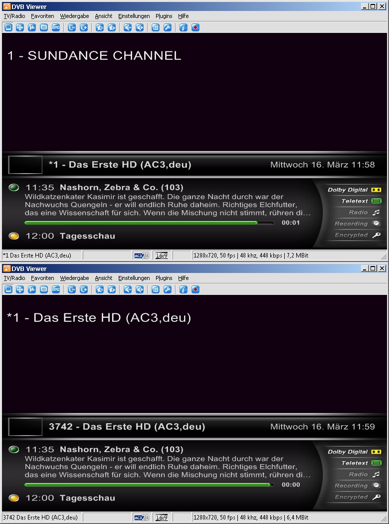 ArcticWolf Posted March 17, 2016 Posted March 17, 2016 Hallo zusammen. Ich bin mir nicht socher, ob es ein Bug ist, oder so gewollt ist, auf jeden Fall ist mir mit dem Update auf die Version 5.6.0.0 des DVBViewerPro die Möglichkeit abhanden gekommen mit dem Ziffernblock der Tastatur durch meine Favoriten zu schalten, sprich direkte Favoritennummern einzugeben. Stattdessen wird hier, ohne Tweaks oder Einstellungen verändert zu haben seit dem Update die Sendernummer gewählt, statt wie sonst vorher die Favoritennummer (siehe oberer Screenshot). Geändert: Favoriten: Der Tweak „Favoriten-basierte OSD-Navigation“ vertauscht jetzt zusätzlich die Bedeutung der Nummern-Actions, so dass Channel0...Channel9 für die Eingabe von Favoritennummern und Fav0...Fav9 für die Eingabe von Sendernummern verwendet werden. Ändere ich in dem Tweak die Option, funktioniert das Wählen der Favoritennummern mit dem Ziffernblock der Tastatur zwar wieder einwandfrei (siehe unterer Screenshot), stattdessen wird aber im Gegensatz zu vor dem Update in der Statusleiste des DVBViewer-Fensters die Sendernummer angezeit; vorher stand hier wie gewohnt die Favoritennummer des gewählten Favoritensenders. Ich bin mir wie gesagt nicht sicher, ob das Ganze so gewollt, oder ein Bug ist. Denn wie es Versionen zuvor gewesen ist Favoritenauswahl durch den Ziffernblock der Tastatur und Anzeige der Favoritennummer im OSD und in der Statusleiste des DVBViewerPro-Fensters man hat sich schon irgendwie die Jahre an seine gewohnte Bedienoberfläche gewohnt Auch ein Update auf die letzte neue DVBViewerPro Version V5.6.1.0 brachte hier keine Veränderung. Schönen Gruß, Daniel DVBViewer: DVBViewerPro Version V5.6.1.0 TV-Karte: Digital Devices Cine S2 V6 PCIe Treiber 2.5.3.92 Grafikkarte: Matrox Millenium P690 PCIe x16 Treiber 2.7.1.6 Mainboard: Gigabyte GA-MA790FXT-UD5P mit AMD 790FX Chipsatz support.zip Quote