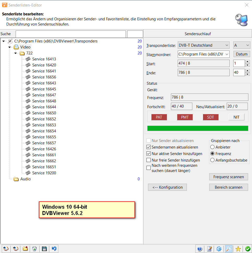 charly2008 Posted May 1, 2016 Posted May 1, 2016 Hallo liebe DVBView User, mein DVBViewer lief unter Win 7 einwandfrei. Jetzt bin ich umgestiegen auf Win 10 auch da lief der DVBViewer (Die Vorgängerversion) einwandfrei. Nun mußte ich Win 10 neu installieren weil Fehler aufgetreten sind. Nach der Neuinstallation von Win 10, installierte ich auch die neue Version von DVBViewer 5.6.2 und habe nun Probleme mit den gefundenen/nichtgefundenen Sendern (siehe Foto). Ich habe anschließend nochmal die Vorgängerversion 5.5.2 installiert und hatte damit auch die gleichen Probleme. Dann habe ich zum testen das, mit dem DVB-T-Stick, mitgelieferte Programm installiert. Das Programm fand auf Anhieb alle Sender und spielte sie auch ab. Jetzt vermute ich das mit dem DVBViewer irgendetwas faul ist oder kann das auch an fehlerhaften Einstellungen liegen?. Hat jemand ähnliche Erfahrungen gemacht? Windows 10 64-bit Hardware: CSL-DVB-T USB-Stick / Dongle (Realtek-Chip) Software: Arcsoft TotalMedia 3.5 Win 7 Codecs: K-Lite codec Pack Ich würde mich freuen wenn mir jemand helfen könnte. Karlheinz Hauser Quote