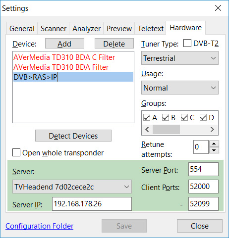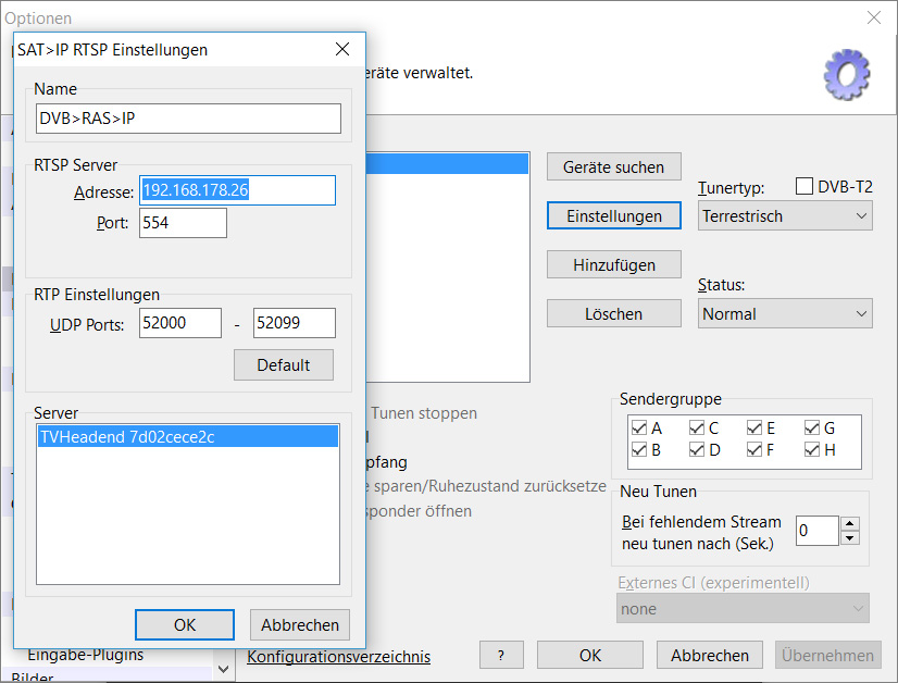 budze Posted June 2, 2016 Posted June 2, 2016 Hallo, Ich bin gerade dabei ein DVB-T(1)-Signal über einen DVB>IP-Server (TVHeadend) in den DVBViewer zu schleifen. Mit Transedit (4.1.1) finde ich auch alle Sender und über die Vorschau kann ich auch Bild+Ton sehen. Das gleiche über den aktuellen DVBViewer (5.6.2) eingebunden führt jedoch zu einem Schwarzen Bild ohne Ton. Hat jemand eine Idee, was ich falsch gemacht haben könnte? Vielen Dank! Quote