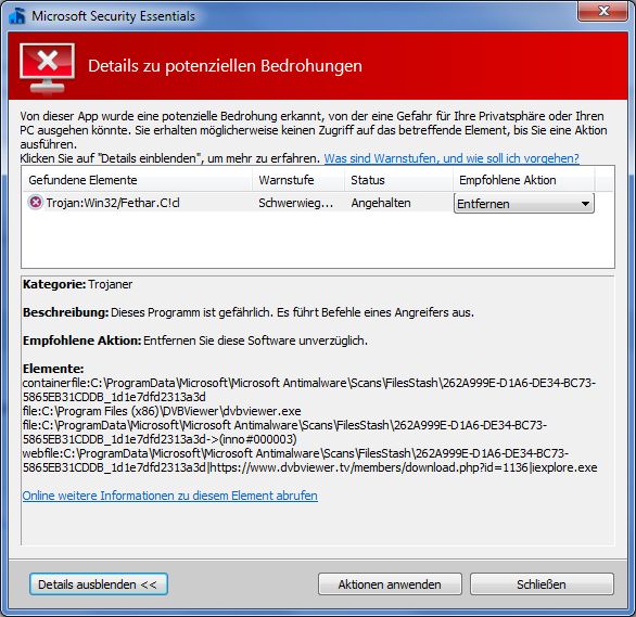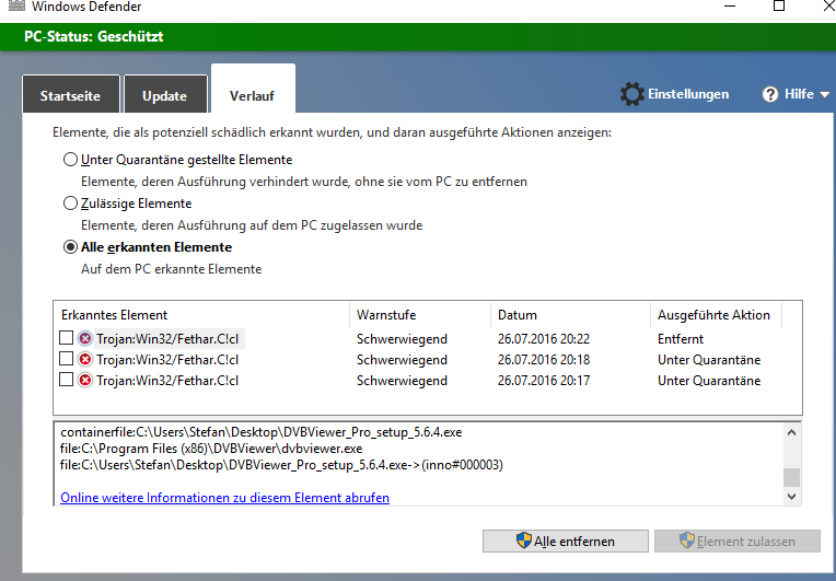 Rayman Posted July 27, 2016 Posted July 27, 2016 @lvi: Nur weil es bei Dir nicht vorkommt, heißt nicht dass andere im Unrecht oder virenverseucht sind :-) Ich habe am WE auf Windows 10 umgestellt und damit hat der DVBViewer zunächst ausgezeichnet funktioniert. Gestern funktionierte dann plötzlich die COM-Schnittstelle und damit Plugins nicht mehr. Dann meldete der Windows Defender: Trojan:Win32/Fethar.C!cl in der DVBViewer.exe und dem Setup-Paket: Ich habe die entsprechenden Ausnahmen hinzugefügt, aber auch bei Neuinstallation konnte der COM-Server nicht neu registriert werden. Kann man den COM-Server von Hand registreren? Ich meine das ging irgendwie mit regsrv, habe aber hier und die Web nix mehr gefunden ... Quote