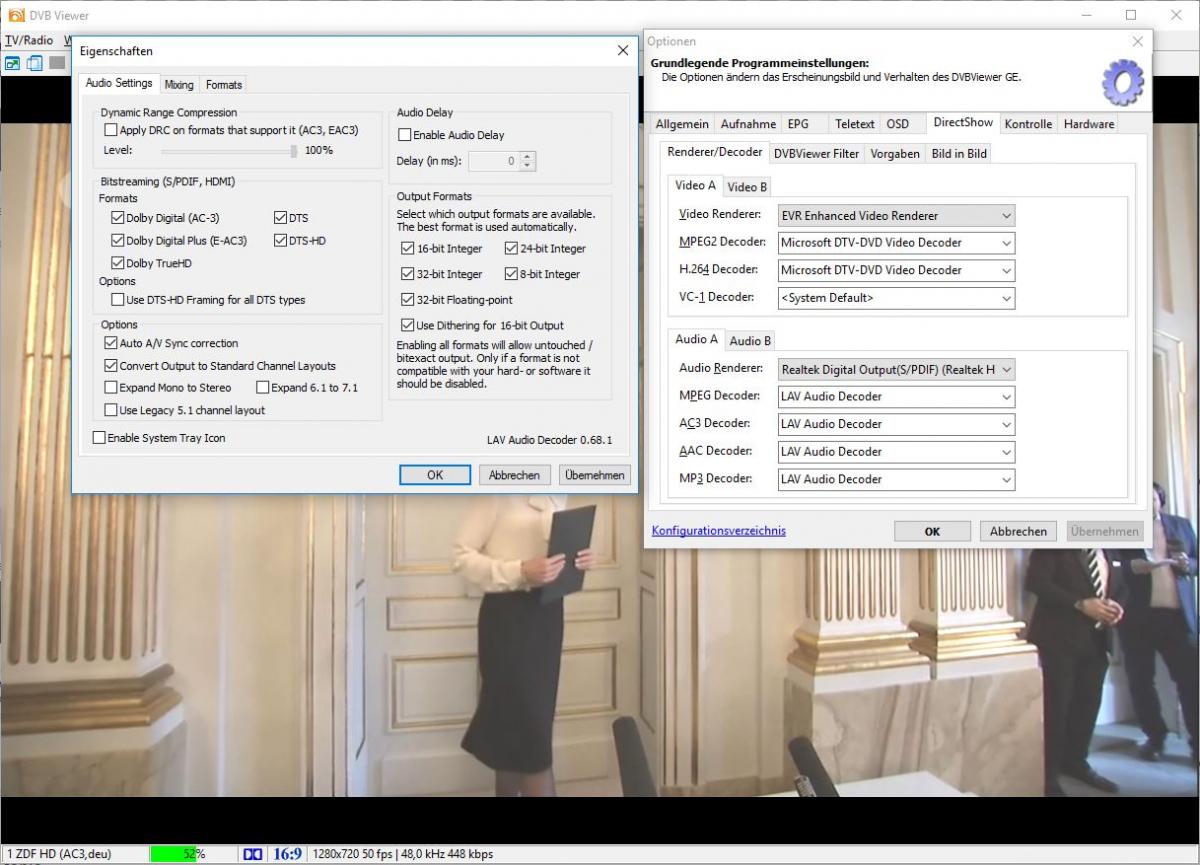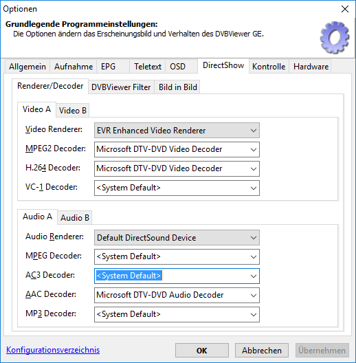 guckmal Posted October 13, 2016 Author Posted October 13, 2016 Installiere mal die LAV Filter und stelle die als Decoder ein bzw. zumindest bei AC3. Hm, versteh ich dich richtig, dass es ein Windows Problem ist und nicht an DVBViewer GE liegt? An onboard-Sound kanns auch nicht liegen? Ich frage deshalb weil mein Board schon so alt ist, dass es keinen Realtec-Win10Treiber dafür mehr gibt. Quote