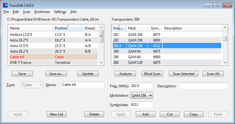 Griga Posted October 16, 2016 Posted October 16, 2016 Mit dem Tool TransEdit (siehe Downloadbereich) kannst du eigene Einträge in Transponderlisten ergänzen (oder neue Listen erstellen) und dann auch gleich scannen. Etwas anders gesagt: Du frisierst damit die Datei DVB-C_All.ini nach eigenem Geschmack. Mehr dazu hier http://de.DVBViewer.tv/wiki/Sendersuchlauf#Transponderlisten_erg.C3.A4nzen Quote