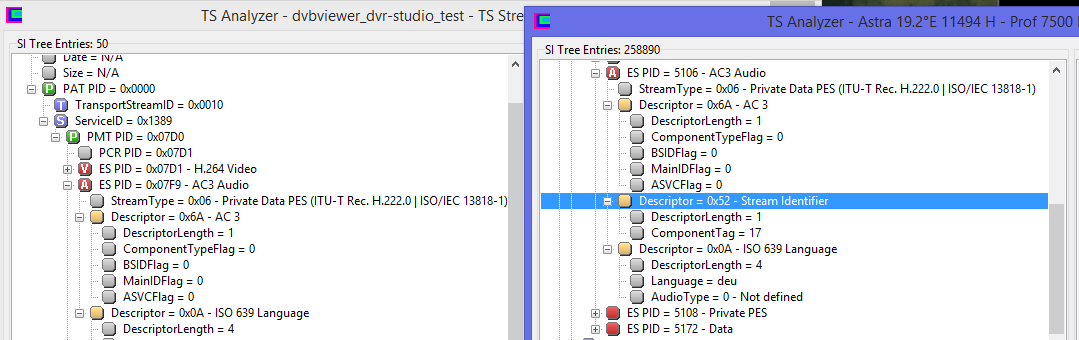 Griga Posted January 27, 2017 Posted January 27, 2017 Tatsächlich. Ändere ich die Bytes bei den beiden Audio-Streams, funktioniert das TS-File auch im DVBViewer. Gut dass du dir zu helfen weißt. Wie es scheint macht das DVR-Studio bei allen Dateien, aber nur beim ersten Payload eines jeden Audiostreams. Alle Audio-Streams, oder nur AC3? Könnte eine Audio betreffende Option in DVR-Studio daran beteiligt sein? Eine Mail mit einem Link zu meiner obigen Analyse an den DVR-Studio Support wäre vielleicht einen Versuch wert. Bis zum Beweis des Gegenteils ist davon auszugehen, dass es sich um einen Bug handelt. Quote