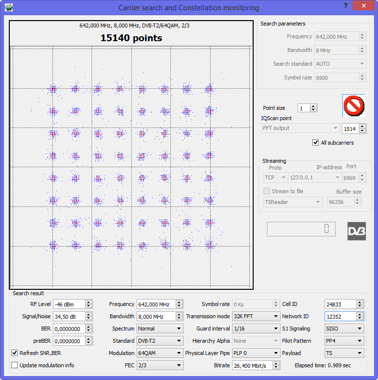 Derrick Posted March 2, 2017 Posted March 2, 2017 Da ist guter Rat teuer Wie @Tjod halte ich ein Reparieren von solchen Sticks eher für unwahrscheinlich. Übrigens werden die beiden Tuner bei mir genauso in der hardware.xml erkannt. Daran liegt es also nicht. Bei mir kommt DVB-C auch über Glasfaser und für T(2) haben wir eine Dachantenne, obwohl ich den Alex auch mit ner verstärkerlosen Zimmerantenne fehlerfrei empfange. Der Stick ist sogar in der Lage, einen astreinen Blindscan zu produzieren. Allerdings nicht mit dem DVBViewer sondern mit Crazyscan2 Ich habe mal einen T(2)-Blindscan und das Constellation Digraramm vom T2 Transponder 642MHz, PLP0 angefügt. (OT ) Ich würde es noch mal mit Transedit probieren. Quote