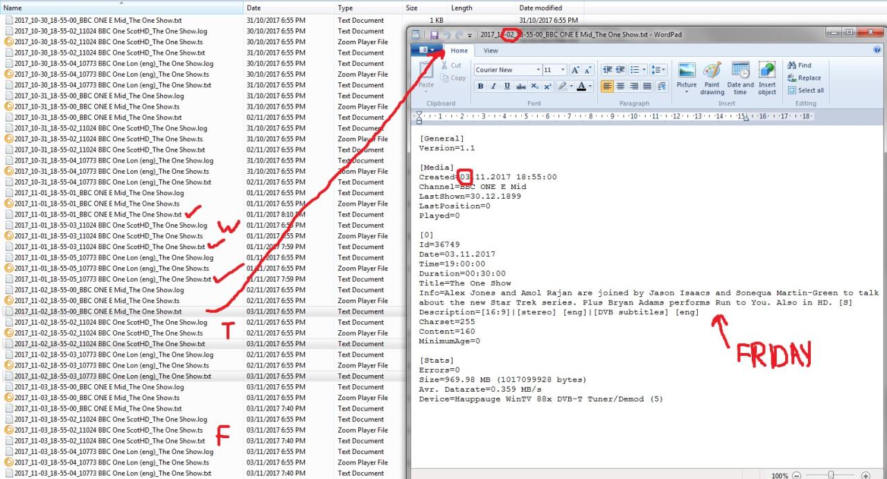 2. The One Show was recorded again from BBC One E Mid on Thursday November 2nd (30 minutes version). However, the corresponding txt file was created on Friday November 3rd when the next One Show recording started (!). Obviously the first created txt file has been overwritten by another file with the same name, but different content. With other words: The content was updated at this point, but not the execution date/time that became part of the filename (together with the unchanged title and channel name).