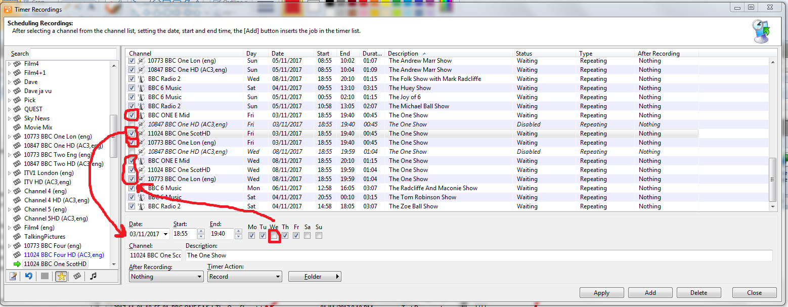 Two separate sets of scheduled and repeating recordings for the One Show on BBC One. M\T\T\F 30 mins, and separate timers for Wed to capture the 60 mins long broadcast.