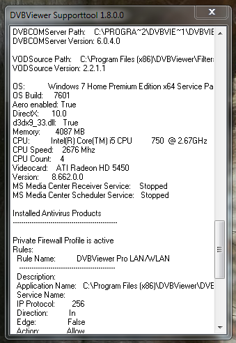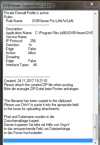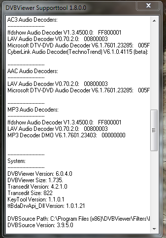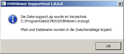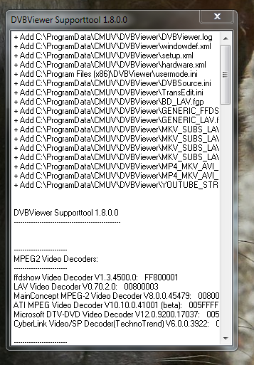 VIBAR Posted November 24, 2017 Author Posted November 24, 2017 Ja, das habe ich inzwischen auch bemerkt. Ich bin wohl bisher nach Hackbarts Korrektem Posten eines Problems vorgegangen (habe es also gelesen): Starten des Viewers im Debug-Modus Das Problem: Schwarzer Bildschirm (Kurze Anzeige des laufenden Programms, z.B. Das Erste, dann nur schwarzer Bildschirm) und kein Ton wie gehabt. Nach Beenden des Viewers habe ich dann das Supporttool.exe ausgeführt. Das Supporttool.exe ist bei mir in C: Programme(x86) und wenn ich es öffne, bekomme ich den Hinweis"Dieses Programm muss im DVBV-Verzeichnis ausgeführt werden". Es erschien nur ein weiteres kleines Fenster, dessen Inhalt ich per snipping tool im Anhang beigefügt habe. Jedenfalls komme ich deshalb nicht weiter. Wo finde ich das DVBV-Verzeichnis? Quote