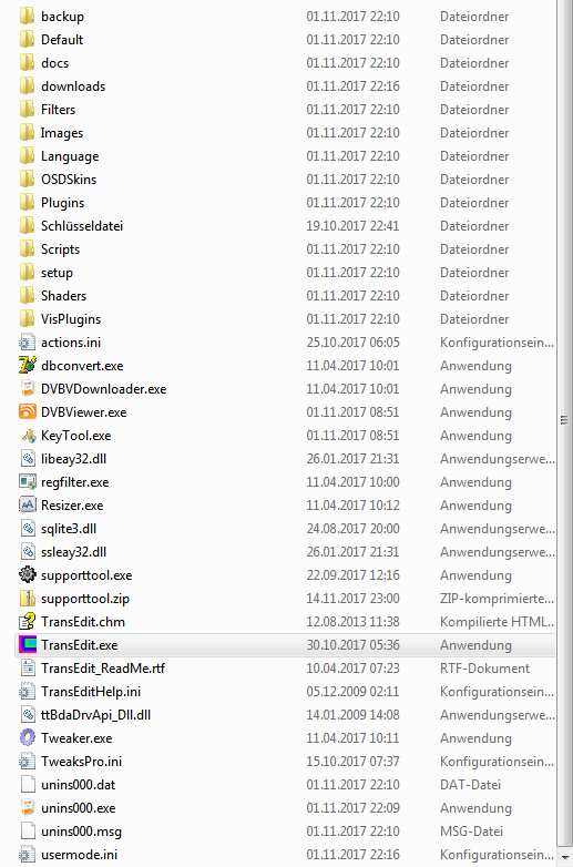 VIBAR Posted December 2, 2017 Author Posted December 2, 2017 Hallo awaschko, besten Dank für die Unterstützung bisher, aber mir scheint unsere Kommunikation scheitert bisher vielleicht daran, dass ich DVBV-Installationsanfänger bin (Seit 7 Jahren empfange ich wohl problemlos TV , den DVBV habe ich damals nicht selbst installiert). Wenn ich deinem Rat folge (was ich übrigens schon getan habe), also P4- Führen Sie supporttool.exe im DVBViewer-Installationsverz. aus (wo sich DVBViewer.exe befindet), dann erscheint ein Fenster mit dem Hinweis"Dieses Programm muss im DVBV-Verzeichnis ausgeführt werden". Da stellen sich mir 2 Fragen: Obwohl sich der DVBViewer.exe bei mir in C:Programme(x86) befindet und ich dort supporttool.exe ausgeführt habe - also ganz nach Anleitung Punkt 4 - erscheint, wie zuletzt erwähnt, litaneiartig "Dieses Programm muss im DVBV-Verzeichnis ausgeführt werden". Wieso das denn? Wo ist dann bei mir das DVBV-Verzeichnis oder heißt das naiv gefragt, ist bei mir der DVBViewer.exe an der falschen Stelle? Vielleicht hilft der Blick in den Ordner DBViewer in C: Progamme, den ich als Screenshot anhänge, weiter. Quote