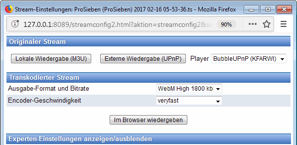 Griga Posted November 28, 2017 Posted November 28, 2017 3 hours ago, Tjod said: Das dürfte das Thema UPnP Controller sein. Mit der Funktion habe ich mich noch nie befasst. Auch mangels Gerät, das ich so beschicken könnte. Einen Fernsehapparat gibt's hier nicht. Jetzt ist mir jedoch eingefallen, dass die App BubbleUPnP auf einem Android Tablet als Testobjekt dienen könnte. Und das klappt tatsächlich. Der Ablauf: Sicherstellen, dass in den DMS-Optionen -> Web/UPnP -> UPnP-Controller aktivieren eingeschaltet ist. BubbleUPNP auf dem Tablet starten. Auf der Medien-Seite des DMS Web Interface das wiederzugebende Objekt auswählen (Sender, Aufnahme, Video...) bzw. den Play-Button links davon anklicken. Hinweis: Was auf der Medien-Seite erscheint, wird durch die Senderliste, vorhandene Aufnahmen und die DMS-Optionen -> Media-Sammlungen bestimmt. Eventuell muss man dort erst Pfade einrichten und dann im Webinterface auf der Aufgabenseite die Media-Datenbanken aktualisieren lassen. Es kann etwas dauern, bis der DMS alle angegebenen Verzeichnisse abgeklappert und den Kram erfasst hat. Es erscheint das Stream-Konfigurationsfenster. Dort ganz oben in der Player-Auswahlliste (die hier nur erscheint, wenn Bubble UPnP aktiv ist) das Zielgerät auswählen. Dann auf "HTTP Einzelner Stream" klicken. Die Wiedergabe auf dem Tablet startet (Bubble UPnP delegiert die Wiedergabe von Aufnahmen oder TV bei mir an den MX Player) und am PC erscheint das UPnP Controller Fenster des Webinterface, das aber nichts mehr zur Sache tut. Die Player-Bedienungselemente dort scheinen zumindest in diesem Testfall nicht wirklich zu funktionieren (gibt es andere Erfahrungen?). Das UPnP Controller Fenster sieht sehr provisorisch aus und müsste zumindest HTML-mäßig überarbeitet werden. In welchem Zustand die Funktionalität ist, kann ich mangels Kenntnis / Erfahrung nicht sagen. Eine Beschränkung auf SD kann ich hier nicht feststellen. Allerdings kann ich der rudimentären Beschreibung von @craig_s auch nicht entnehmen, bei welchem Ablauf unter welchen Umständen sie ihm wo begegnet ist. Insgesamt ein neuer Forschungsbereich... Quote