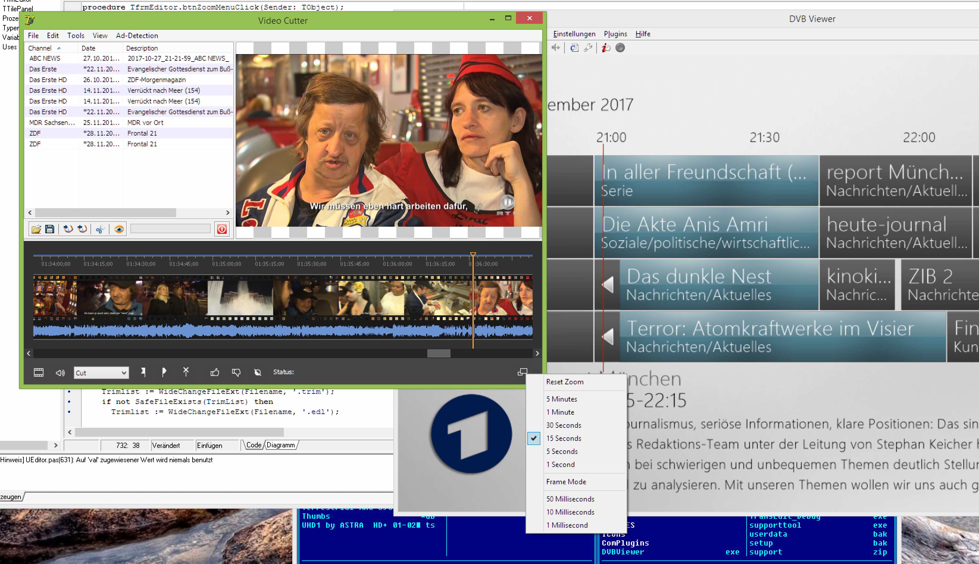 hackbart Posted December 17, 2017 Author Posted December 17, 2017 Hi, just a small work in progress note from me. The editor itself is almost done. You can even change the DPI like in the DVBViewer. For those like me who have problems after hours of computer work with reading the small texts on the display I assume i have to use a higher resolution for the icons, otherwise they look awful after rescale. I focused my work on editing with the keyboard. You can easily set the cut points without using a mouse, but if you prefer using the slider display, you can also work with this. Via Shift+Left/Right you jump +/- 10s and with left/right you move to the next i-frame. At the moment i work on a Batch Manager class which allows to create Jobs for Indexing, Trimming and analyzing the stream for commercial breaks via Comskip. I made a neat small class which does all the magic and once everything works together i hope i can add a useful com interface. Before i do this i will do some heavy brain storming. Quote