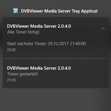 Griga Posted December 27, 2017 Posted December 27, 2017 Die Benachrichtigungen kommen vom Media Server Tray Tool. Der Media Server selbst kann das nicht bewerkstelligen, da er als Service nicht im Benutzerkonto läuft. Der Mechanismus (insbesondere die Kommunikation zwischen Server und Tray Tool) informiert nur über Zustandsänderungen: Media Server nimmt zur Zeit auf <--> nimmt nicht auf. Du erhälst also keine Benachrichtigung wenn eine Aufnahme startet oder stoppt, während noch eine andere läuft. Insofern macht es nicht viel Sinn, in dem Fall einen Titel anzugeben. Man müsste die ganze Vorgehensweise umbauen. Quote