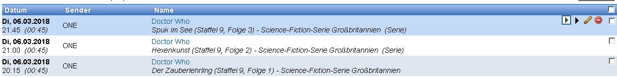 Campus Posted March 7, 2018 Author Posted March 7, 2018 (edited) Ich hatte mir einfach angeschaut, wie die URL zum HTTP-Stream zusammengebaut wird und diese URL dann direkt von der Übersichtsseite der Aufnahmen und der Detail-Ansicht im EPG verlinkt. Damit erspare ich mir das extra Browserfenster, dass man sonst immer schließen muss. Anbei ein ZIP-File mit den geänderten Dateien für die 2.0.4. SVCweb.zip OOTB = out-of-the-box = Funktion die im Produkt mit ausgeliefert wird Quote Verständlichere Posts wären wünschenswert Da kann ich nur um Entschuldigung bitten, manchmal ist man einfach zu sehr im beruflichen Wording gefangen. Edited March 7, 2018 by Campus Quote