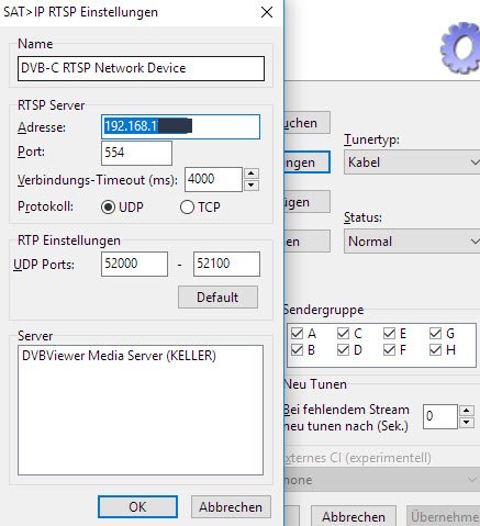 ralphm Posted June 21, 2018 Posted June 21, 2018 (edited) Hallo Community es ist vielleicht eine Einsteigerfrage, aber ich hoffe, ihr könnt mir trotzdem hier weiterhelfen. Mein Server: - Win10 Home - Hauppauge WinTV solo HD DVB-C - DVBViewer Pro 6.1.1 - Media Server 2.1.1 Davor hatte ich den DVBViewer 5.x mit dem Recordingservice 1.x so eingestellt, dass ich aus dem Netzwerk heraus LiveTV sehen konnte. Jetzt habe ich upgegradet auf die aktuellsten Versionen, die entsprechenden Einstellungen lt. Anleitung gemacht, aber ich sehe den DVB nicht in der Netzwerkumgebung und kann folglich auch nicht auf ihn zugreifen. Anfangs dachte ich, es liegt am update. Mittlerweile habe ich auf einem anderen Rechner eine komplette Neuinstallation getätigt mit demselben Effekt. Der DBVviewer selbst funktioniert wunderbar auf dem "Server" selbst. Auch wenn ich von einem anderen Rechner per DVB Client zugreife, klappt das perfekt. Lediglich das Mediastreaming geht nicht. In den Optionen ist die Hardware als RTSP Network Device mit der entsprechenden LAN IP eingetragen. Der Media Server Wizard legt in seiner Konfiguration dann die localhost IP an (127.0.0.1). Aber auch wenn ich die auf die LAN IP ändere, funktioniert das nicht. In Win10 selbst ist Media streaming aktiv. Die Ports sind alle verfügbar, Firewall blockt nix. Habt ihr einen Tipp, wo ich noch suchen kann. Ist es möglich, dass Win10 da etwas blockiert? Wie gesagt, auf 2 Rechnern probiert mit demselben Ergebnis... Bin zwar IT-seitig einigermaßen bewandert, aber in dem Streaming / Media Thema kompletter DAU.... Viele Grüße Ralph Edited June 21, 2018 by ralphm Bilder angehängt Quote