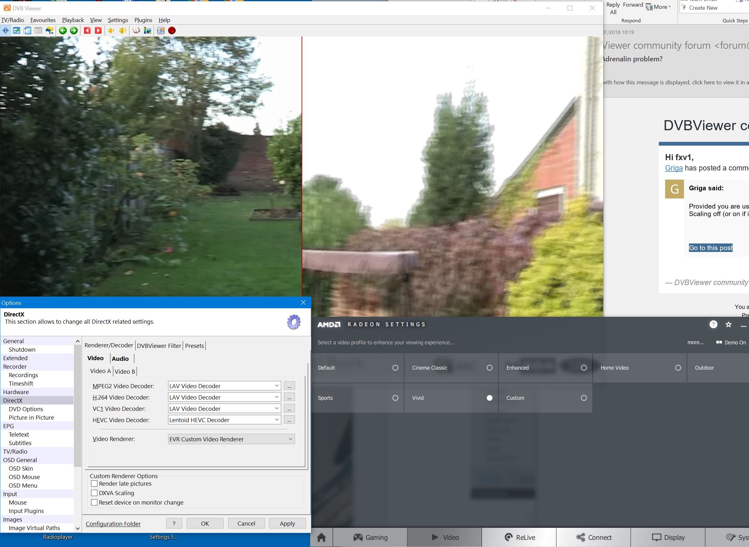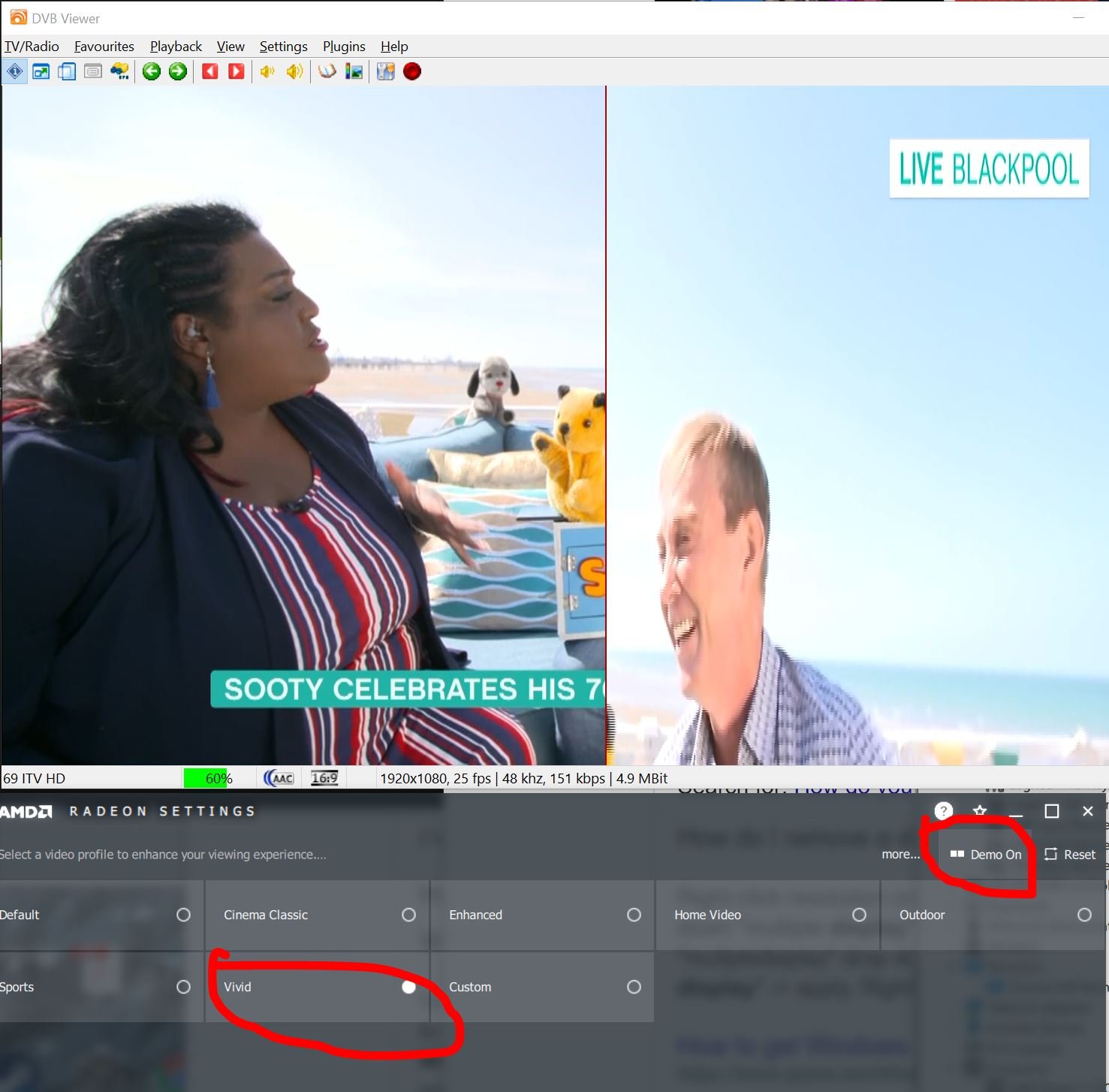fxv1 Posted July 23, 2018 Author Posted July 23, 2018 (edited) I have set Adrenalin to Default on the video settings which seem to be ok....having said that I still have to do a rebuild playback when I change some channels. If I use "vivid" for video settings it starts ok for a couple of seconds then zooms to a larger value. Changing the zoom settings in DVBViewer still has no real effect...back to default for now. Custom seems ok but changing custom brightness is a problem. Edited July 23, 2018 by fxv1 Quote