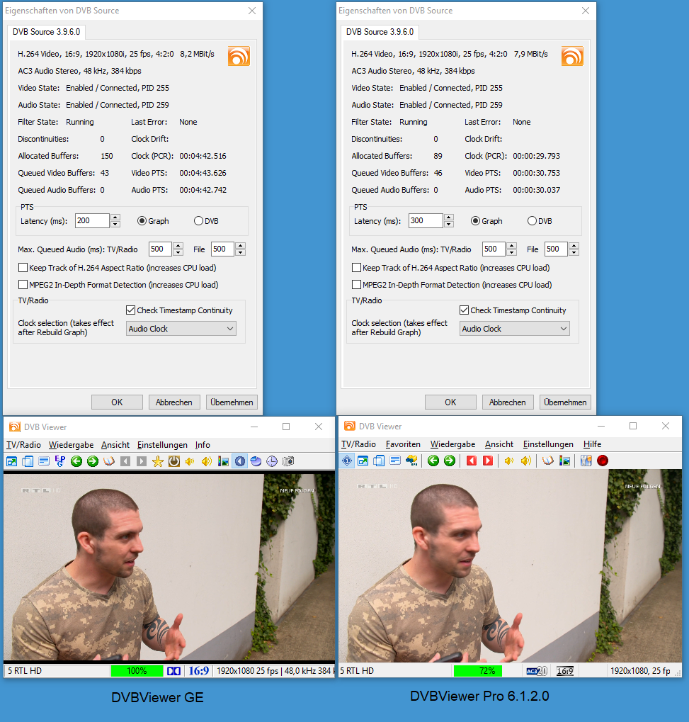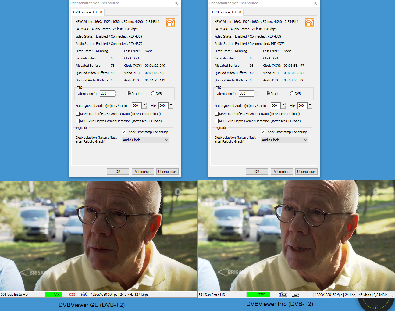 Griga Posted August 30, 2018 Posted August 30, 2018 Ich sehe hier keine Probleme mit DVBViewer Pro 6.1.2 -> DVB-T2-Aufnahme starten von Bibel TV HD (macht wegen der geringeren Auflösung nicht so viel CPU-Last) -> TS Datei während der laufenden Aufnahme mit dem DVBViewer GE 3.6.5 abspielen. Das auf einem PC ohne Hardware-Beschleunigung für das Dekodieren von HEVC, sowohl mit dem LAV Video Decoder als auch mit dem Lentoid HEVC Decoder. Quote