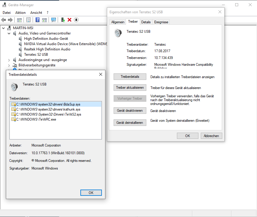Nibble CH Posted October 13, 2018 Posted October 13, 2018 (edited) Ich habe es jetzt gerade zum Laufen bekommen, allerdings ohne Fernbedienung. 1. Treiber deinstallieren 2. Neustart 3. Den Treiber von dort installieren: https://www.terratec.de/details.php?artnr=134439#.W8GcRGgzYuV 4. Neustart 5. Jetzt ist das Gerät in der Systemsteuerung als "Terratec S2 USB" (siehe Screenshot) 6. Im DVBViewer unter Hardware das alte Gerät entfernen, neues Suchen und hinzufügen 7. DVBViewer neu starten Gruß Martin Edited October 13, 2018 by Nibble CH Quote