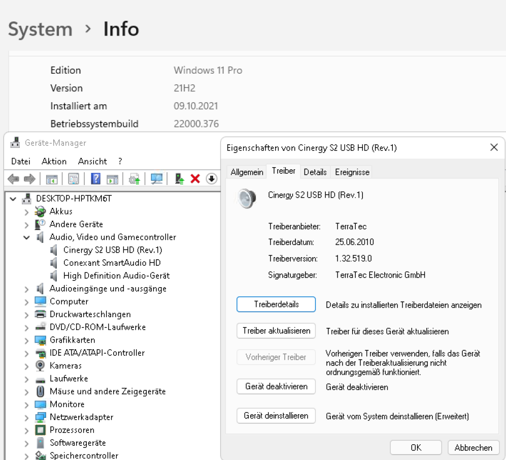 Alfred E. B. Posted May 8, 2020 Posted May 8, 2020 Am 7.5.2020 um 07:55 schrieb Alfred E. B.: Habe das Problem gelöst: Box noch nicht anschließen, Software noch nicht installiert Den 64-bit Treiber von der aktuellen Webseite https://www.terratec.de/details.php?artnr=134439? laden (134439-10-64.exe). Im Gerätemanager auf "Terratec S2 USB" gehen und Treiber aktualisieren mit "Auf dem Computer nach Treibersoftware suchen" (manuell, nicht im Internet! Dann kommt BSoD ? ) Sucht in C:\Windows (oder wo auch immer bei Euch Windows liegt), Gerätemanager findet dann automatisch die richtigen Treiberpakete und installiert sie Box anschließen, Software installieren Läuft jetzt stabil, mit programmierten Aufnahmen ? nutze nur Radio. Ist klar CD Qualität (16Bit, 48KHz, über 800 bit/s). Bloß nicht die Funktion "Boss Taste Strg+Alt+B" drücken, führt zum Absturz. Ist mir sowieso unklar, was die Taste soll?!! Die von Michael P. beschrieben Vorsichtmaßnahmen sind nicht mehr nötig. Starte immer sofort mit USB und Netzteil angeschlossen Viele Glück, dass es so auch bei Euch klappt! Da war ich voreilig: Jetzt folge ich doch Michaels Prozedur und schalte das Netzteil (schaltbare Zwischensteckdose) erst nach Hochfahren ein. Vielleicht muss man sich auch man immmer gleichzeitig mit der linken Hand an's rechte Ohrläppchen ? fassen... bei Windows weiß man nie... Quote
