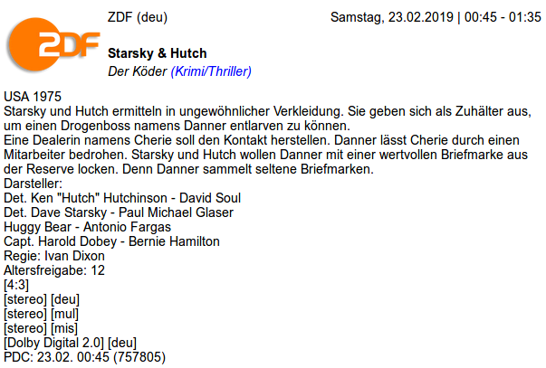 Basic.Master Posted February 16, 2019 Posted February 16, 2019 Beim ZDF wird in der EIT im Component Descriptor im Beschreibungsfeld angegeben, ob eine Sendung Originalton hat ("Originalton", z.B. bei Starsky & Hutch Fr/Sa nachts) oder nicht ("ohne Originalton"). Bei AC-3-Spuren scheint die Description im DMS in der Detailansicht eines Events immer angezeigt zu werden, bei MP2-Spuren (wo beim ZDF Originalton bzw. AD laufen) dagegen nicht. Ich meine, dass das früher mal anders war und die Beschreibung generell angezeigt wurde. Daher wäre es super, wenn der DMS das wieder entsprechend anzeigen könnte....momentan steht da stattdessen komischerweise der Wert "stereo", der wohl vom component_type herkommt. Quote