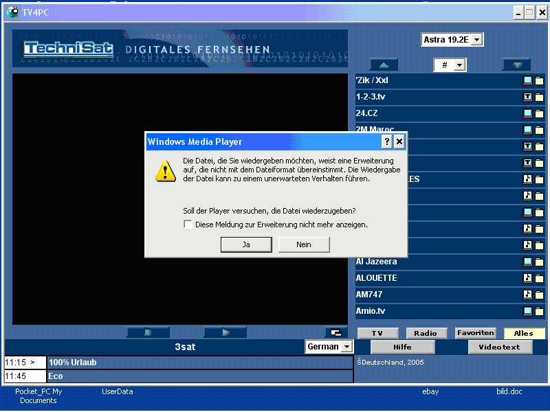 Klausing Posted January 18, 2005 Posted January 18, 2005 also ich verstehe nicht warum Du hier immer von TV4PC was postest? Warum nimmst Du nicht den DVBViewer? Übrigens ist diese Dateiendung wahrscheinlich mit irgendeinem DVDPlayer verknüpft. Da ist eine solche Fehlermeldung OK. Enfach den Haken setzen und OK klicken. Ansonsten ist hier das DVBViewer-Board. Falls Du also Probleme mit dem DVBViewer hast , dann immer her damit Quote