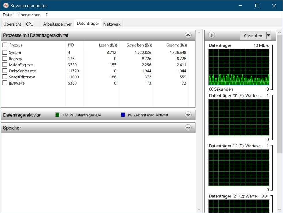 catshome Posted March 7, 2019 Posted March 7, 2019 Hallo, über den Taskmanager im Ressourcenmonitor könntest du mal schauen was auf den Datenträgern von welchem Task geschrieben wird. Quote