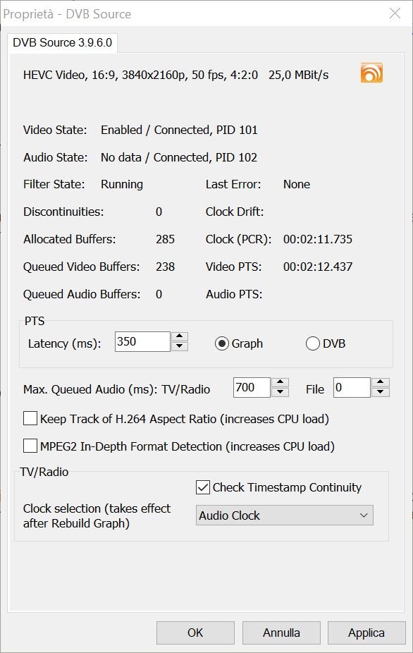 Marco Massari Posted August 11, 2019 Posted August 11, 2019 (edited) Hello, Congratulations on the forum, very useful. I,m a happy user of DVBViewer pro for years. I noticed a small problem. In practice with A***D I can seeing all the HD and UHD channels of the tivusat platform through a regular active card. I have only one problem in a channel called RAI 4k that although it is tuned and you can see perfectly fluid images thanks to the hardware decoding of my RTX 580. But now it seems that only in that channel DVBViewer does not detect the audio stream, so that it does not appear at the bottom of the program view, even the encoding symbol (it should be E-AC3). I tried changing the AC-3 decoder but nothing from the settings. Also changing PID and putting the format recognition in the settings changes nothing. As a decoder I have tried both LAV audio decoder and AC3 Filter. If you want i can put the transport stream where there seems to be the E-AC3 audio stream at PID 102. Thanks for anyone who can help me. Marco Edited August 11, 2019 by Marco Massari Quote