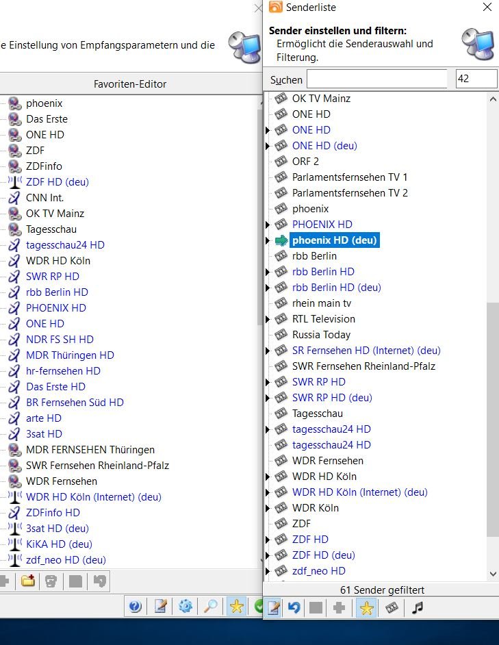 dbvHEK Posted September 16, 2019 Posted September 16, 2019 Habe DVBViewer auf dem neuesten Stand. Wie auf der beiliegenden Grafik gesehen werden kann erscheinen im Favoriteneditor links neben dem Sendernamen die entsprechenden Gerätesymbole. (Antenne, SAT-Schüssel, WEB-Symbol) Wenn ich jedoch den Cursor in TV-Bild an den rechten Rand bewege erscheinen die Favoriten mit einem einheitlichen Symbol (Filmstrip) wie rechts auf der beiliegenden Grafik gesehen werden kann. Wie kann ich erreichen, dass die richtigen Symbole auch in den Favoriten erscheinen. dbvHEK Quote
