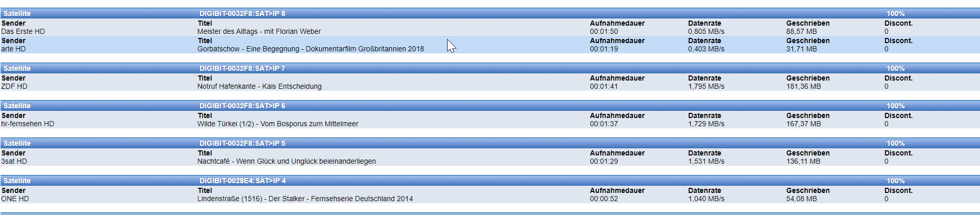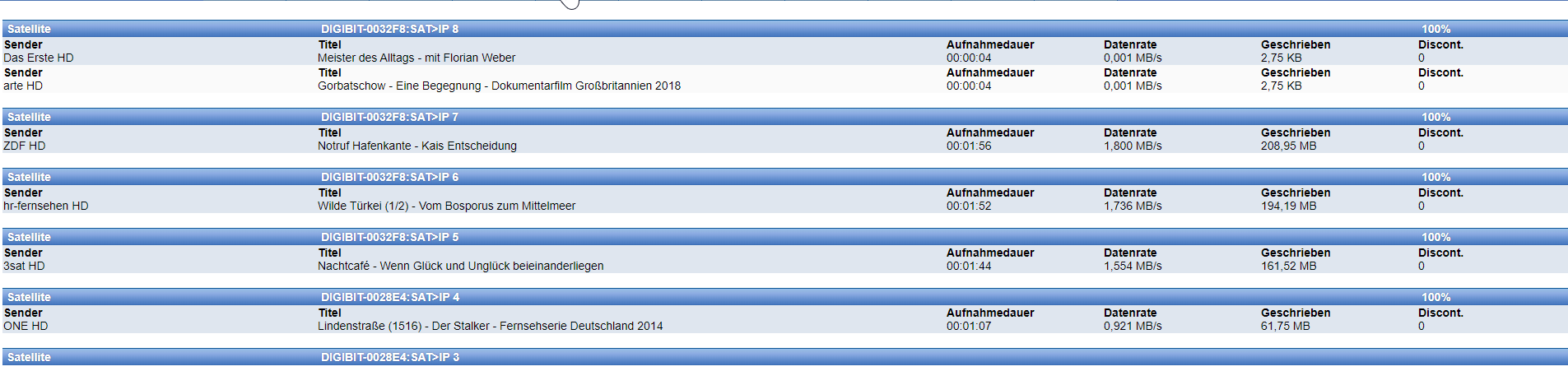tizian1998 Posted October 10, 2019 Posted October 10, 2019 Hallo zusammen, auch wenn der Thread ein wenig älter ist, passt das Thema bei mir auf den Kopf Ich habe den aktuellen DMS im Einsatz und via RTSP zwei Digibit R1 (unicable) angebunden. Bei vier Aufnahmen läuft alles sauber durch, ab der 5. oder 6. Aufnahme (und was ich hierbei schon beobachtet habe, sobald der DMS das Signal vom zweiten Digibit bekommt, fallen die ersten Aufnahmen "hinten runter" und es kommen dann bei den ersten Aufnahmen Fehler (Service ID not found in PAT+No data within one minute, restarting!). Auch im Monitor des Digibit ist das erkennbar (habe noch ein paar Sreenshots angehängt). Wenn ich die Digibits so konfiguriere, dass kein Stream geshared wird und jeder Aufnahme ein eigener Tuner zugewiesen wird, tritt das Problem logischerweise immer beim Start der 5. Aufnahme auf. Viele Grüße Kai support.zip Quote