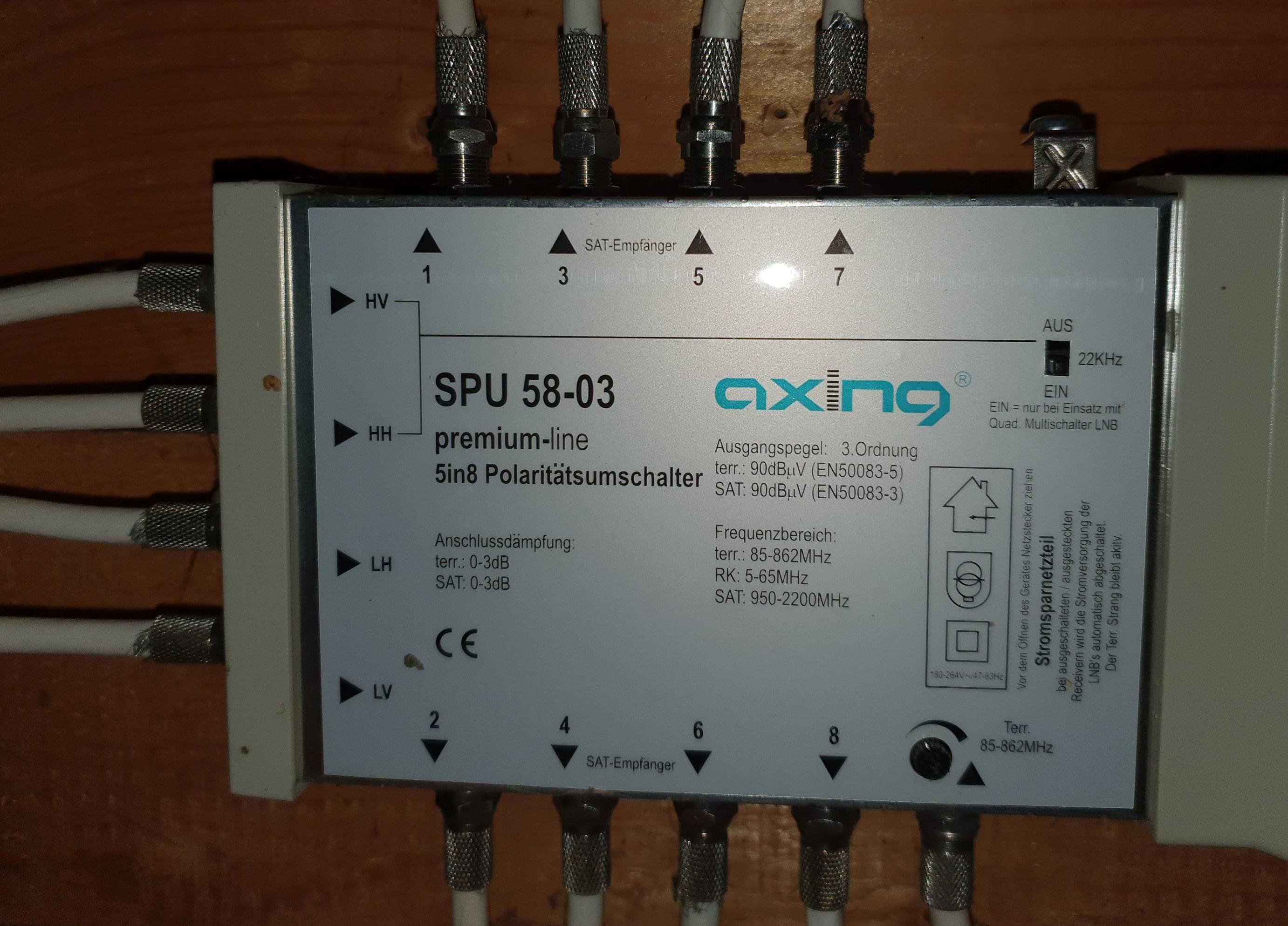 Maverick-F1 Posted January 19, 2020 Posted January 19, 2020 (edited) Hallo zusammen, bei meinen Leuten habe ich vor Kurzem einen SAT-IP Server (XORO 8100) "installiert". Genauer gesagt an 2 Ausgängen (ich hab's auch mit nur einem versucht) des vorhandenen 8-Port Multi-Switches. Aus der Doku und dem Internet werde ich nicht so ganz schlau: Die einen sagen, dass es nicht geht, andere sagen, dass es geht. So wie ich das bisher verstanden habe, liegt das vermutlich am Multi-Switch (schon ein älteres Modell: Axing SPU 58-03, aber SAT-IP allein ist keine Option). Ich kann leider nicht mit Sicherheit sagen, ob das LNB ein Quad oder Quattro Modell ist - jedenfalls kommen 4 Kabel am Switch an. Der SAT-IP-Server läuft und ich komme auch problemlos an das Web-Interface - aber er sagt mir nur dass er keinerlei Signal bekommt, obwohl der Anschluss an Port 3 & 4 (oder nur 4) lt. Doku korrekt ist. Kennt sich hier jemand damit aus? Bekomme ich das mit diesem Multi-Switch überhaupt hin? Oder brauche ich einen anderen? Oder geht das mit dem SA-IP-Server gar nicht (und ich brauche einen anderen)? Anbei noch ein Bild vom Switch - links kommen die Kabel vom LNB an... Vielen Dank schonmal für Eure Hilfe - aktuell bin ich ziemlich ratlos... Update: Ich hab' jetzt doch noch herausgefunden, welches LNB dranhängt: Ein Hirschmann CS 404 - müsste demzufolge also ein Quad-LNB sein... Edited January 19, 2020 by Maverick-F1 Quote