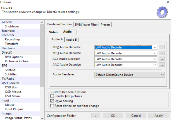 John Tikis Posted February 16, 2020 Author Posted February 16, 2020 On 2/15/2020 at 10:08 PM, Griga said: Yes. But the discussion will continue here. The error message in your screenshot above is related to audio hardware (see Options -> DirectX -> Audio -> Audio Renderer). It is created by the DirectShow playback system. The text does not originate from DVBViewer, but Microsoft. As far as I can see It is not related to DVB hardware or a RTSP network device as its representative in DVBViewer network clients. No problem Just sent you the support file. The DirectShow setting (Audio Renderer) has been the same (unaltered) for ages. Just checked and they are exactly the same for tuner 1 as in tuner 2, however the issue appears only with tuner 1. Quote