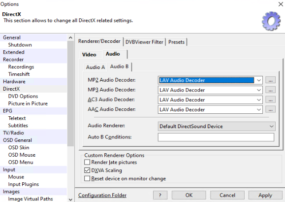 Griga Posted February 15, 2020 Posted February 15, 2020 4 hours ago, John Tikis said: Can I PM it to you or send it in a more private way than a forum post? Yes. But the discussion will continue here. The error message in your screenshot above is related to audio hardware (see Options -> DirectX -> Audio -> Audio Renderer). It is created by the DirectShow playback system. The text does not originate from DVBViewer, but Microsoft. As far as I can see It is not related to DVB hardware or a RTSP network device as its representative in DVBViewer network clients. Quote