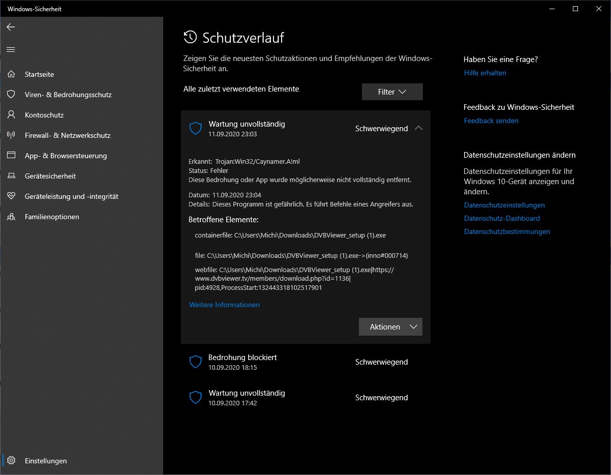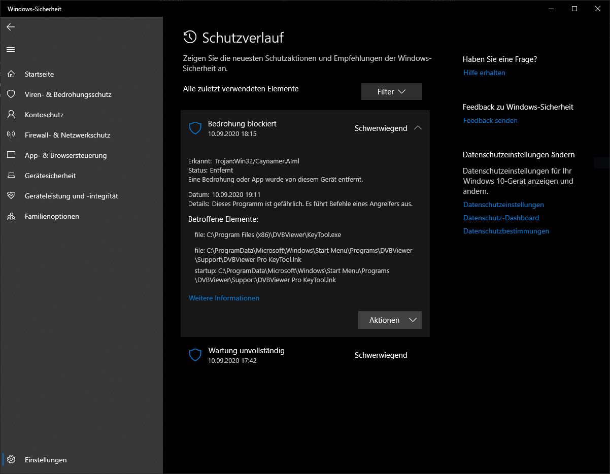big3mike Posted September 10, 2020 Author Posted September 10, 2020 Danke für deine Antwort. Defender hat jetzt scheinbar etwas gelöscht. Aber der Viewer funktioniert immer noch einwandfrei. Ich versuch mal einen Screenshot reinzustellen: Die untenstehende Meldung "Wartung unvollständig" stammt vom Download. Meine Windowsversion ist die 2004 (19041.508) Vielleicht kannst du ja mit diesen Angaben etwas anfangen. Schönen Abend, Michael Quote