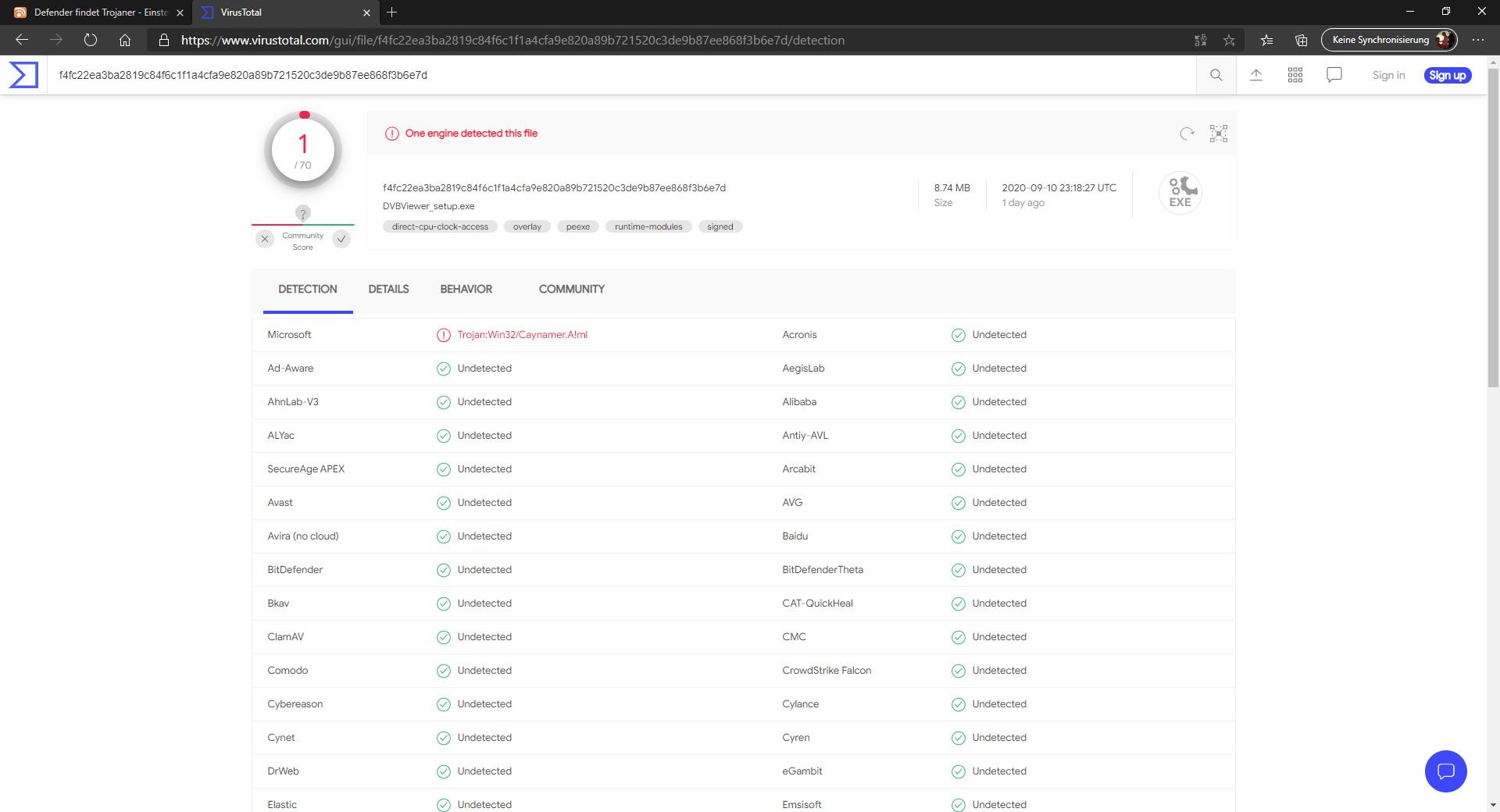 big3mike Posted September 12, 2020 Author Posted September 12, 2020 Hier das Ergebnis von VirusTotal: Offline Defender Scan war übrigens ohne Probleme. Grüsse, Michael Quote