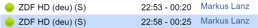 MaM Posted November 4, 2020 Author Posted November 4, 2020 (edited) vor 17 Minuten schrieb Griga: Warum nicht gleich so? Unmissverständliche Beschreibungen sind wohl nicht jedermanns Sache... Mit mir kannse reden, wie mit einem Menschen ? ich dachte schon, ich wäre da klar gewesen. Vielleicht hat Dich die offtopic "Ergänzung" mit dem Sommerzeitproblem anderer Leute abgelenkt? Aber ja, ok "wenn sich eine Sendung verschiebt..." ist vielleicht wirklich missverständlich, sorry. Zitat In dem Fall hätte wahrscheinlich die Option "Start/Stopp durch EPG-Status" geholfen. Dann wäre die falsche Sendung gar nicht aufgenommen worden. Allerdings mag nicht jeder die Aufnahmesteuerung in die Hände des Senders legen... Nee, damit habe ich schon viel Leid erfahren müssen. Bei den ÖRs gehts noch, aber ein paar andere Sender sind da sehr virtuos und das führt doch öfters zu Totalausfällen. Zitat Wenn die ursprüngliche (falsche) Aufnahme zur Deaktivierung des Timers für eine nachgeholte Sendung führt, heißt das, dass diese Aufnahme mit dem Titel und Untertitel der eigentlich für diesen Zeitpunkt vorgesehenen Sendung in der Aufnahmedatenbank stand. Im Moment kann ich mir das nicht richtig vorstellen, da der DMS ja angeblich den Dateinamen an den geänderten EPG angepasst hat. Insofern hätte das auch so in die Aufnahmedatenbank gelangen müssen. Ich gehe dem mal nach... Um das nochmal KLAR zu sagen: der Timereintrag bleibt "alt", so auch die Logfiles. Nur die TS Datei auf der Platte hat dann den Namen der Ersatzsendung. Also guckte man vorigen Sonntag in die Aufnahmen des DMS stand da brav "Brokenwood" auf der Platte war aber "Anne Will" (und drin war natürlich auch das Coronablabla) Und der neue Brokenwood Timer für kommenden Sonntag war erstmal deaktiviert. Noch schlimmer sieht es aus, wenn sich durch den Entfall die ganze Reihenfolge einer Serie ändert. Z.B. ist vorigen Freitag Eisenbahn Romantik ausgefallen (Folge 1000), da gabs dann natürlich am Montag keine der üblichen Wiederholungen, sondern es wurden andere Folgen eingeworfen. Und so verschiebt sich seit Montag das EPG jeden Tag. Für (hoffentlich) morgen sieht es dann so aus (die Aktivierungen wurden schon von Hand korrigiert, es war genau umgekehrt): Hier ersetzt dann Folge 1000 mit 60min zwei normale Folgen a 30min. Wären die Timer nicht korrigiert worden, hätte ich zwei überlappende Aufnahmen und reichlich Bastelarbeit... Also muss man Aufpassen wie ein Luchs... Edited November 4, 2020 by MaM Quote