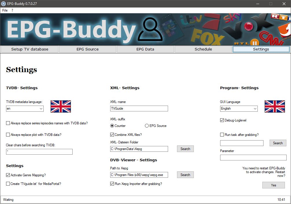Claus Peter Posted December 5, 2020 Posted December 5, 2020 Hi. I like to introduce our latest tool, called "EPG-Buddy". This program should make EPG grabbing as easy as possible. Up to now a good EPG is one of the most complicated things to achieve in the HTPC world. Nearly all available sources needs complicated scripting and fiddling with XML files or similar. "On Air"- EPG often is of bad quality or not available at all. Available Sources for grabbing EPG data from online sources are hard to configure, especially if you are new to this topic. Here is where EPG-Buddy jumps in. With EPG-Buddy you can configure your EPG with a few mouse clicks and after you're done your EPG is refreshed completely invisible and automatic on a daily or weekly base. You can use various sources for your EPG data. As EPG-Buddy delivers it’s data in XMLTV compatible format it can be used together with nearly every available TV solution for PC including, but not limited to MediaPortal (both, 1 and 2), Argus TV, NextPVR, DVBViewer,… Some features may not be available for every solution but the main features are working with all of them as long as they are able to use XMLTV compatible EPG data.. The recent supported EPG data sources are: Tvguide.com - a fast and free source for North American countries (USA, Canada, Mexico) Rytec Network - a fast and free source for many European countries. TVSpielfilm - a fast and free source for German speaking countries epgData - a fast but paid source for German speaking countries Clickfinder - a fast but paid source for German speaking countries WebGrab+Plus – a paid but very slow source for nearly every country and language in the World. The "free" version is crippled too much to be usable at all. Best is to avoid WebGrab if ever it's possible External XML files - to use XMLTV- compatible XML files from other sources. Some of the comfort features may not be available or even possible for all TV solutions. But it can be used with all of them, as long as they are XMLTV compatible. Full support incl. all comfort functions is available for DVBViewer, MediaPortal 1 and 2, NextPVR and Argus TV. A full blown manual (around 50 pages) is included in the installer. But it also can be downloaded separately if you first want to get a clue. If you have installed the program, an extra download of the manual is not necessary. This program is free software: you can redistribute it and/or modify it under the terms of the GNU General Public License as published by the Free Software Foundation, either version 3 of the License, or (at your option) any later version. This program is distributed in the hope that it will be useful, but WITHOUT ANY WARRANTY; without even the implied warranty of MERCHANTABILITY or FITNESS FOR A PARTICULAR PURPOSE. See the GNU General Public License for more details. You should have received a copy of the GNU General Public License along with this program. If not, see <http://www.gnu.org/licenses/>. The source code is included in the installer package. A note about the first run. When calling up the first time, the relevant data must be loaded from the TVDB for all series in the entire EPG (that is very, very many). But that only happens the first time. On the one hand it takes forever and on the other hand it would completely overload the TVDB. Therefore, the data is cached locally and only updated when changes are made. As a result, the very first run of Epg-Buddy unfortunately takes a very long time, possibly many hours. The local cache must first be built up from scratch. It depends very much on your internet speed and the number of channels that you have configured for the comparison with the TVDB. However, the second time through, it shouldn't take much longer than about an hour, depending on how many channels you have configured and how much of it is loaded via WebGrab. In my everyday life, a slow internet connection (approx. 5 Mbit throughput instead of the 50 MBit that I have to pay) with all German-language free TV channels from Astra 19.2, of which about 60% with TVDB comparison and TV Spielfilm as data source, it takes usually about 35 - 40 minutes until the EPG is completely finished. And unfortunately it must also be pointed out that it happens far too often that various anti-virus programs incorrectly classify EPG-Buddy or almost all other programs written in the same programming language as viruses. This is always a false report. If you have EPG-Buddy from a trustworthy source such as the official download page, you can and must ignore these messages and set up appropriate exceptions. Unfortunately, the manufacturers of (all) AV programs are absolutely not interested in minimizing this type of constant false reports. Thank you for reading and have a lot of fun with EPG-Buddy. The recent Version is 0.7.0.27 and can be found at:Download Quote
