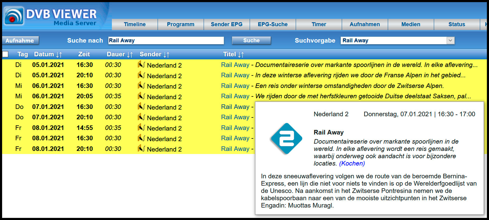 MaM Posted January 5, 2021 Posted January 5, 2021 (edited) Ich finde irgendwie nicht die richtige Einstellung. Die Episoden gleichen sich häufig im Titel und im Beitext, deshalb deaktiviert der Autotimer Mechanismus sie brav. Aber in der Detailbeschreibung sind sie dann doch anders und weisen auf eine neue Episode hin. Leider bekomme ich es nicht hin, dass der DMS dies erkennt und einen aktiven Timer erzeugt. (Im Screenshot habe ich alle Vergleiche deaktivert, so wird nun immer ein Timer erzeugt, aber bei den Wiederholungen will ich ihn ja eigentlich nicht...) Irgendeine Idee Meista Griga? (würde ja einen Screenshot hochladen, aber darf nur noch 3k ... soll das ein Witz sein??? ) Hmm, ich seh gerade, der Screenshot ist etwas suboptimal, das Detailfenster verbirgt genau das Problem. Der Text dieser Episode lautet ebenfalls "Documentairserie over markante...". Viele Episoden lauten so, nur der untere Text "In deze sneeuwaflevering..." ist jeweils anders (natürlich nicht bei Wiederholungen). Ich suche also eine Einstellung, die den unteren Text vergleicht und bei Abweichung einen neuen, aktiven, Timer erzeugt. Edited January 5, 2021 by MaM Quote