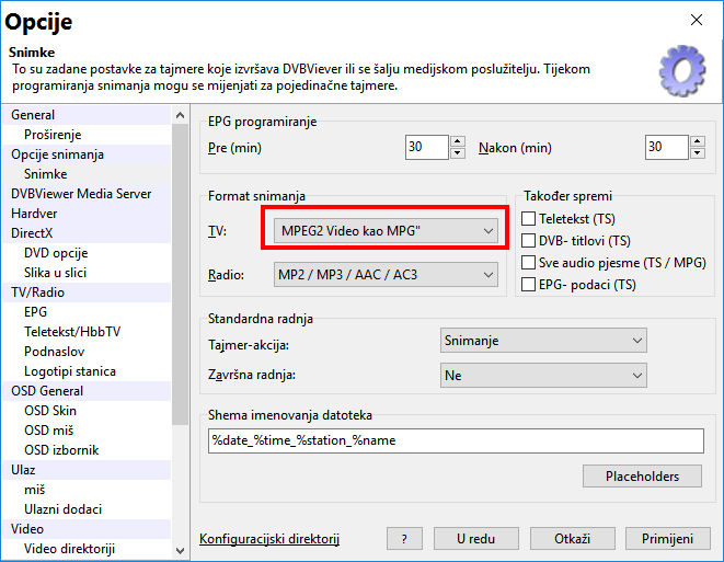 Griga Posted January 22, 2021 Posted January 22, 2021 vor 16 Minuten schrieb draradic: The term 'settings' in the menu is not translated Please contact the author https://www.dvbviewer.tv/forum/topic/61723-serbian-cyrillic-and-croatian-language/ or apply the corrections yourself. vor 16 Minuten schrieb draradic: The recording selection is not recorded in the settings as shown in the attached image, but the recording always takes place in 'TS' format. According to the specifications only MPEG2 Video and MP2/AC3 Audio can be recorded as MPG. If something like H.264 or AAC is broadcasted, DVBViewer automatically switches to TS. Quote
