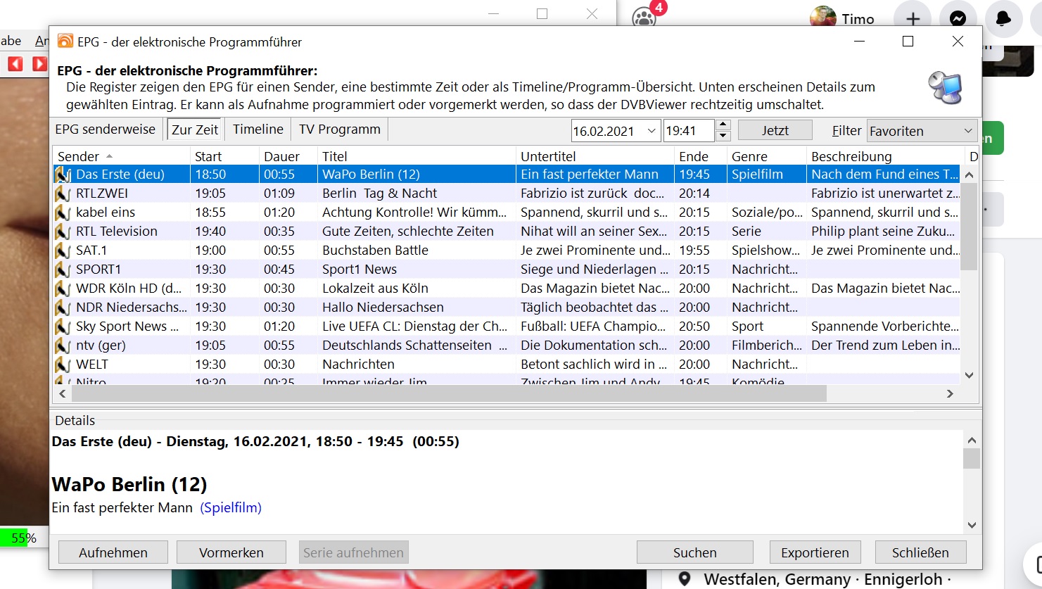 Griga Posted February 16, 2021 Posted February 16, 2021 vor 4 Minuten schrieb Timo1983: solange es jetzt nur ZDF ist geht es ja. Was ich geschrieben habe, gilt für alle Sender. Das ist schließlich ein EPG-Fenster für die Anzeige von EPG-Daten. Eine von EPG-Daten unabhängige Senderliste gibt es im DVBViewer natürlich auch. Siehe TV/Radio -> Senderliste. Oder Einstellungen -> Optionen -> TV/Radio -> Popup-Senderliste einblenden. Die Einstellung lässt im DVBViewer-Hauptfenster eine Senderliste erscheinen, wenn sich der Mauszeiger dem linken oder rechten Rand des Fensters nähert. Quote
