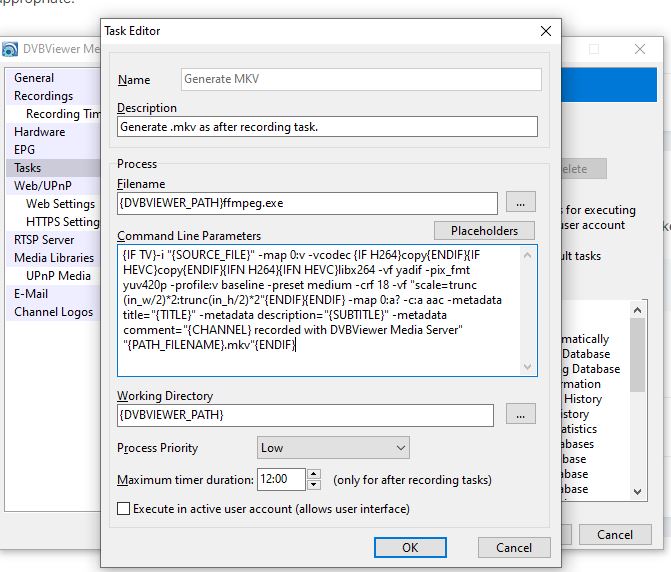Griga Posted May 3, 2021 Posted May 3, 2021 The DVBViewer Media Server uses the following FFmpeg commandline for transcoding recordings to .mkv (with two placeholders in curly brackets for the filenames): -i "{SOURCE_FILE}" -map 0:v -vcodec copy -map 0:a? -c:a aac "{PATH_FILENAME}.mkv" ...at least, if video is H.264 or HEVC. MPEG2 video is transcoded to H.264 with a special command line. Quote