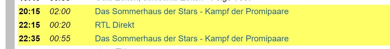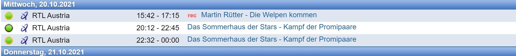 ERSBEA Posted October 20, 2021 Posted October 20, 2021 wenn geplante Sendungen (Mediaserver) aufeinander folgen, den gleichen Namen haben und sich die tatsächlichen Aufnahmezeiten (inklusive Vor und Nachlauf Zeit) überschneiden, wird die 2te nachfolgende Sendung nicht aufgenommen. ist das ein geplantes Verhalten des Mediaservers, oder muss ich etwas umstellen? die Timer werden mit einem automatischen Aufnahme-Timer erzeugt die Bilder zeigen die geplanten Aufnahmen und die Einträge im EPG in diesem Beispiel wird die 2te Folge "Das Sommerhaus der Stars" nicht aufgenommen. die Aufnahme der Ersten Folge, endet mit dem geplanten Ende Quote