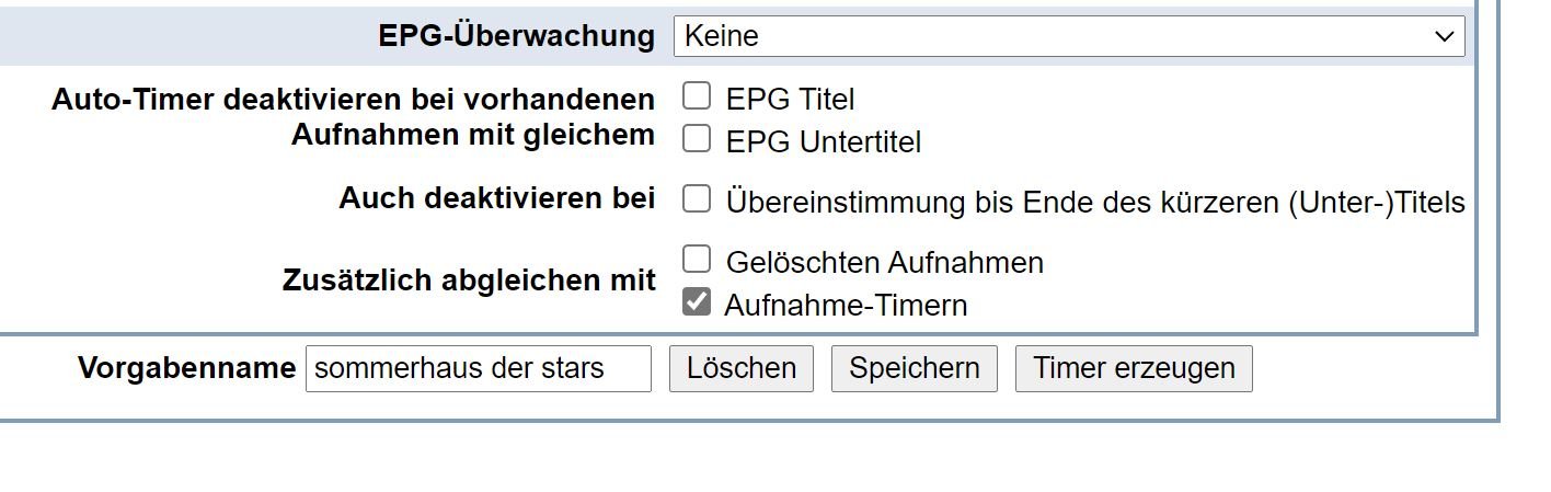 ERSBEA Posted October 22, 2021 Author Posted October 22, 2021 die automatischen Timer werden richtig hinzugefügt, auch als aktiv angezeigt Den Timer um 20:15 habe ich nur für den Screenshot aus dem EPG neu erzeugt. als workaround verwende ich nun für die nachfolgende Sendung einen anderen Sender (RTL und RTL-Austria), dann funktioniert auch die 2te Aufnahme. es wäre auch ein 2tes Gerät für die Aufnahme verfügbar, wenn das nicht mit dem selben möglich wäre. Quote