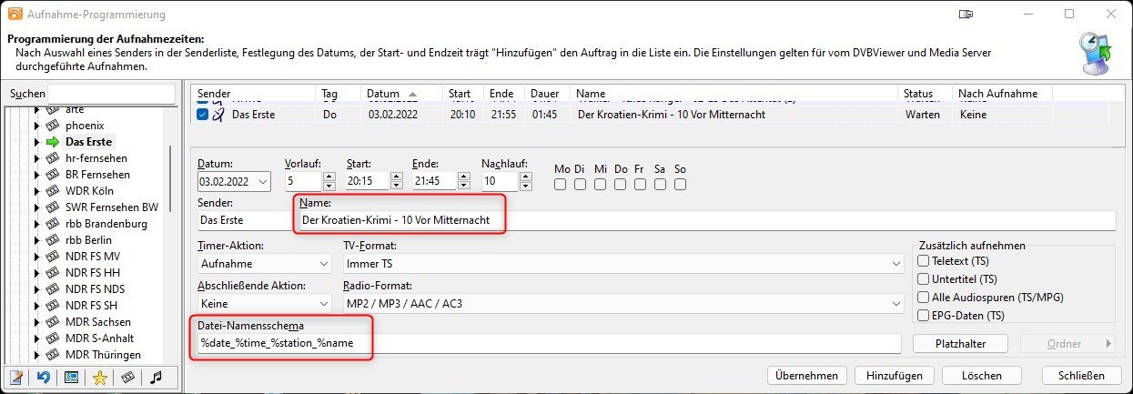 Griga Posted February 1, 2022 Posted February 1, 2022 Das Standard-Datei-Namensschema legst du im DVBViewer unter Einstellungen -> Optionen -> Aufnahme-Timer fest. In der Aufnahme-Programmierung kannst du es dann bei Bedarf für einzelne Aufnahmen abändern. 1 Quote