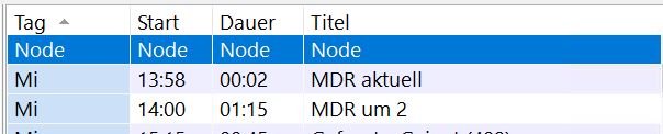 prosperus Posted February 23, 2022 Author Posted February 23, 2022 Hallo Griga, ich hab den neutralen Grundzustand hergestellt (Punkt 1-3). Bei Punkt 4 kommt erwartungsgemäß kein EPG. Der DVBViewer greift als erstes auf den Tuner1 zu und dem habe ich mit kein EPG-Empfang konfiguriert. Punkt 6 - EPG-Aktualisierung per Webinterface angestartet. Bei Punkt 7 funktionierte der EPG-Import tadellos. Bei allen Sendern ist das EPG-Fenster gefüllt und auch die EPG-Info in der Senderinfo des voreingestellten MDR HD zu finden. Aber, aha, kurze Zeit später, lautet die Anzeige auf dem Sender wieder "Keine EPG-Daten vorhanden". Laut EPG per Webinterface würde jetzt (12:45 Uhr) noch "Papa hat keinen Plan" (von 12:30 Uhr, Länge 01:28) laufen. Dieser Eintrag ist jedoch jetzt nicht mehr im EPG des DVBVIEWERs zu finden. Da steht nun als erster Eintrag Node, Node, Node (s. Anlage) Grüße Chris. Quote