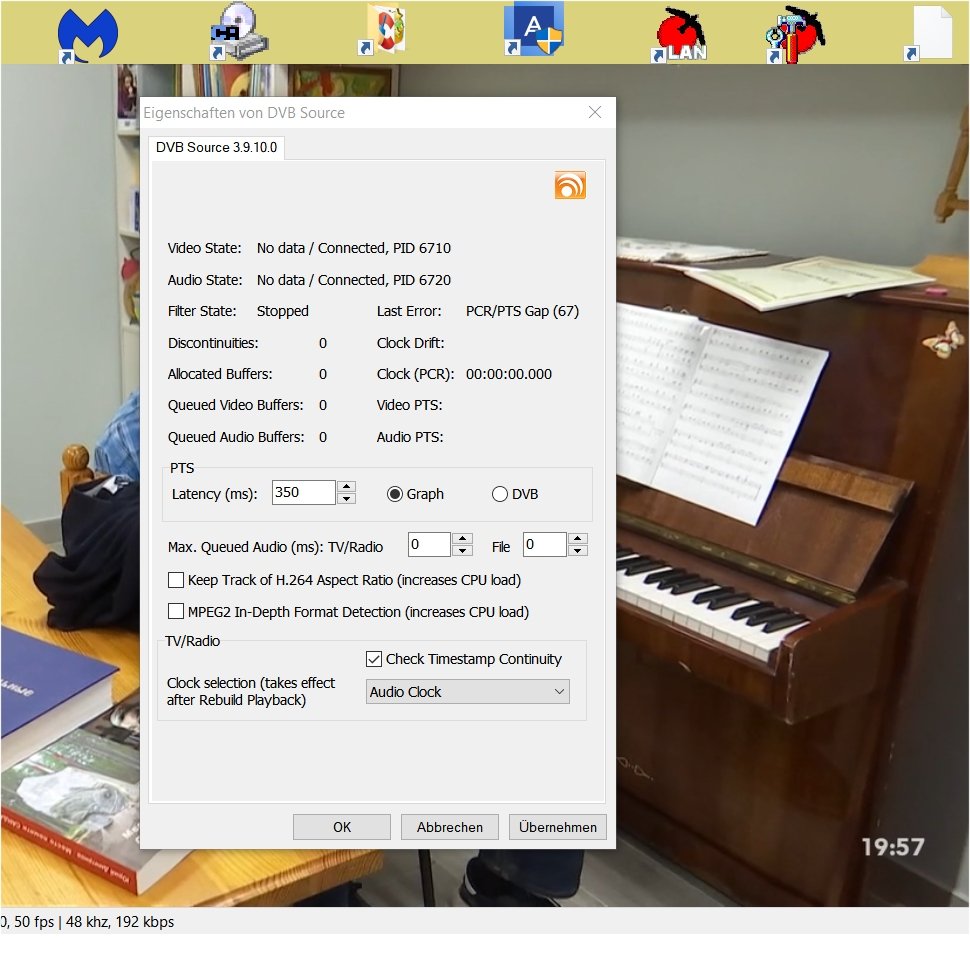 roro Posted March 7, 2022 Author Posted March 7, 2022 7 hours ago, Griga said: Ist der KiKa auch betroffen? Er befindet sich auf der selben Frequenz. Was zeigt die Signalanzeige in der Statusleiste des DVBViewers an? Gibt es einen Unterschied zu den anderen Sendern? Aufschlussreich könnte auch ein Blick auf die Eigenschaftsseite des DVBViewer Filters sein. Was zeigt sie ann, wenn das Problem auftritt? Poste eventuell einen Screenshot. Deine Einstellungen unter Optionen -> Wiedergabe-Komponenten sind etwas schräg und für Windows 10 nicht optimal. Standard wäre, überall wo möglich die LAV Decoder auszuwählen und als Video Renderer "EVR Custom Video Renderer" oder zumindest "EVR Enhanced Video Renderer" einzustellen. Hilft das? Danke für die Antwort. Ja KIKA ist auch betroffen, schau ich aber nie an ☺️. Ist mir deshalb nicht aufgefallen. Signalanzeige in Statusleiste seh ich keine, bei keinem Sender. DVB Filter screenshot sieh unten. Habe alles auf LAV Decoder gestellt und EVR Custom Video Renderer. Unterschied ist, dass der Bildschirm nicht schwarz wird, sondern das letzte Bild als Standbild bestehn bleibt. Danke für die Hilfe Quote