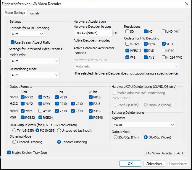 YARD2 Posted June 1, 2022 Posted June 1, 2022 Der 5600G kann das ohne DXVA. Ich hab nur einen 2500U und der macht alles in Software ohne Probleme. Selbst ein alter 4c Atom schafft h264 in Software. HD oder nicht HD hat auch nix mit dem Hacken zu tun. Die Hacken bestimmen für was der eingestellte Decoder verwendet werden soll. Wenn du DXVA eingestellt hast und bei h264 keinen Hacken, dann wird h264 in Software dekodiert. Wenn die Quelle HD ist wird HD dekodiert. AMD/LAVFilter hat da leider Problem mit DXVA bei manchen h264 Streams. Ich habe Video2 mit Microsoft Decoder eingerichtet und kann dann umschalten wenns nötig ist. Quote