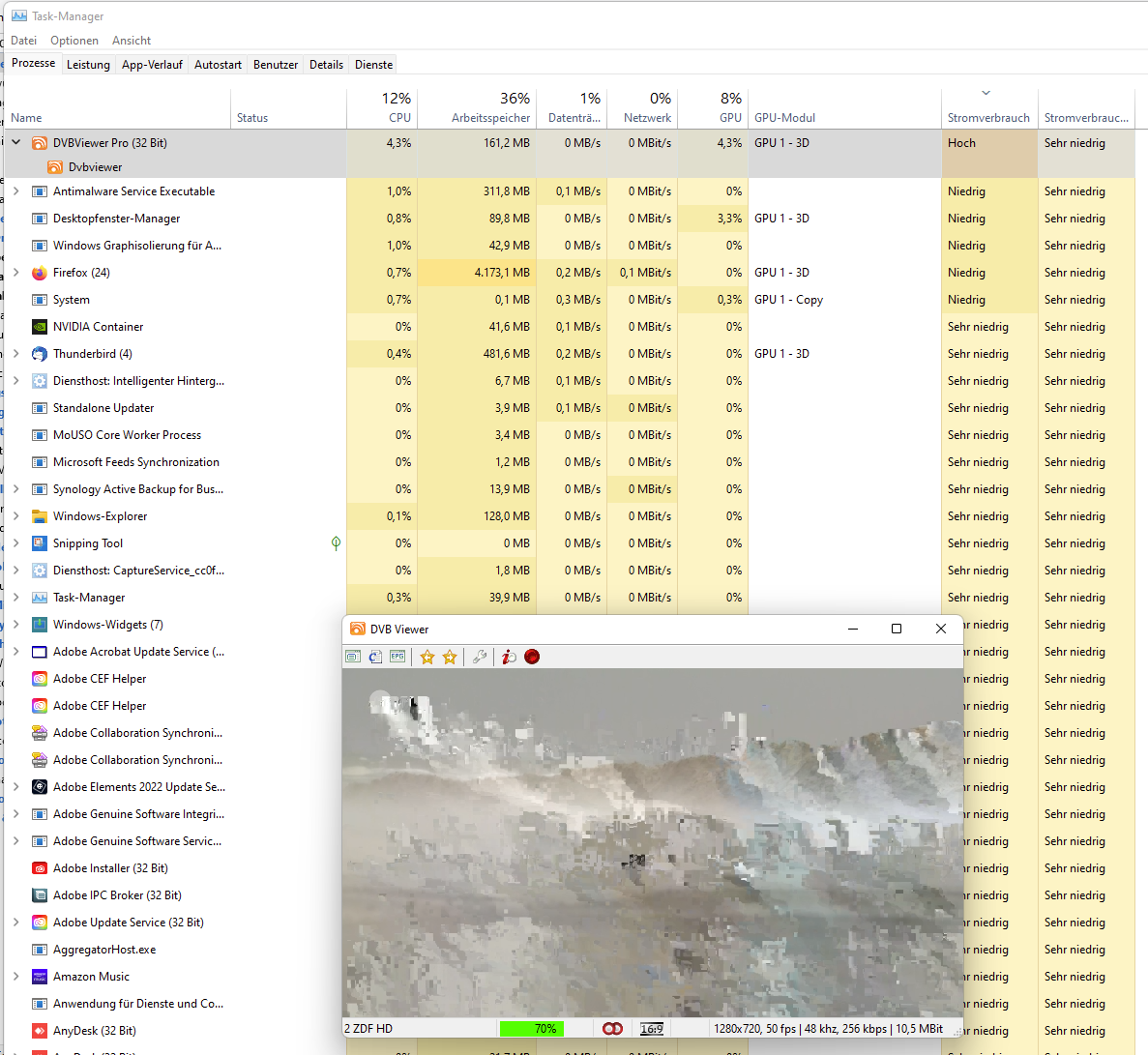 V.Gerdes Posted June 8, 2022 Posted June 8, 2022 Moin zusammen, ich habe seit einigen Tagen das Problem, dass das TV Vergnügen im Laufe der Zeit (Minuten) immer schlechter wird. Am Anfang ist alles top und dann kommen immer mehr Störungen. Anbei ein Beispielbild nach ca. 5 Minuten Hardware: Intel i7 11700 64GB Ram DVBSka S950 V3 NVIDIA GeForce GTX 1650 Windows 11 Wenn ich unter Einstellungen / Optionen den Decoder wechsel oder den Renderer dann ist das Bild ca. 1 Minute wieder super und dann kommen die Störungen wieder. Ich habe noch keine Einstellungskombi gefunden, wo das Bild konstant gut bleibt. Leider kann ich nicht mehr sagen, seit wann das Problem besteht. Was kann ich tun? Hat jemand eine Idee? Quote