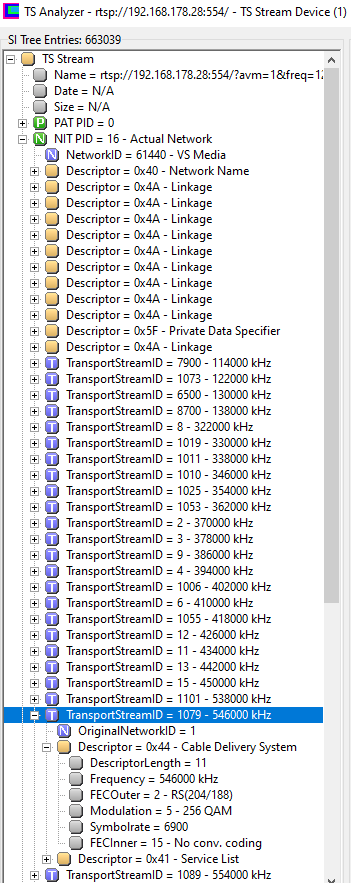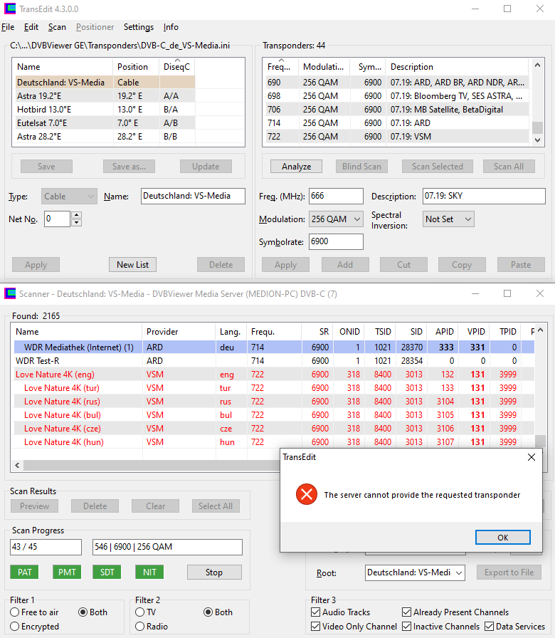 MaDu Posted July 19, 2022 Posted July 19, 2022 (edited) Bei mir taucht auf der Fritz!Box 6490 mit TransEdit 4.3.0.0 die Fehlermeldung "The server cannot provide the requested transponder" nur auf wenn, unter Scannen die Option "Scan NIT and update transponderlist" ausgewählt ist. Die vom Anbieter veröffentlichten Transponder und Parameter sind in der angehängten DVB-C_de_VS-Media.ini vollständig enthalten und empfangbar. Beim Scannen wird neben den 44 bekannten Transpondern ein zusätzlicher Transponder 45 mit den Parametern 546/6900/256QAM "gefunden" (siehe Screenshot), der aber scheinbar gar nicht existiert. Bei Bedarf lade ich auch noch gerne die m3u Dateien von der Fritz!Box hoch. MaDu Edited July 19, 2022 by MaDu Quote