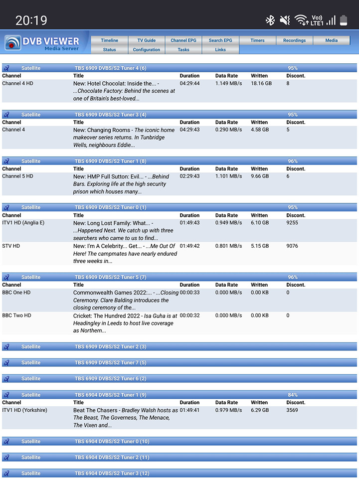 Phattz88 Posted December 6, 2022 Posted December 6, 2022 Hi, I currently have a Freesat setup with TBS 6909 & TBS 6904 and a standard 43cm sky dish. For the past 3 weeks I've been having problems where randomly channels will disappear (BBC1HD, BBC2HD) and basically work when they want to. Today for example BBC1HD was working this morning but now all I get is a blank screen, the signal shows around 96%. Other channels will constantly glitch (ITV1 seems to be most affected atm for glitching, I've also tried different regions) I thought this might be a dish issue and have had 2 installers out to check and they both basically say the same thing (signal is ok at the dish and the other end of the cables) but can't say why I'm having problems. To rule out a hardware fault I have tried different tuners on different cards, full rescan ect but no fix. I set some timers last night to check and as you can see from the attachment, All 3 ITV1 channels were unwatchable and BBC channels didn't start (would randomly start through the night for a few minutes but than stop, the recording folder had about 1.5GB of multiple .ts files) Any ideas as to what might be my problem please? support.zip Quote