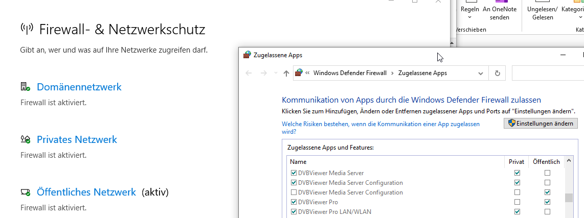 CodeChegga Posted November 7, 2023 Author Posted November 7, 2023 (edited) Am 5.11.2023 um 17:23 schrieb Griga: Glaubst du. Sowohl in der SystemInfo.txt für dein altes Notebook als auch in der für das neue Notebook steht aber das für Sat>IP im allgemeinen tödliche: So endlich mal wieder Zeit für die kleinen Probleme 🙂 Danke für den Hinweis, mal in die Windows defender firewall zu schauen... Im Anhang die settings, wie sollte das nun optimalerweise angehakt sein? (Siehe Screenshot) Oder muss ich weiter in die Tiefen und bestimmte Ports prüfen? Sicher im Home-Netz und abgesichert nach außen. Auf die DE TV-Streams etc. von außen bietet die neue Fritzbox ja die schnellen Wireguard VPN Verbindungen an. Edited November 7, 2023 by CodeChegga Quote