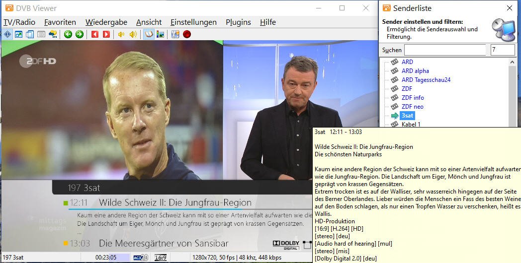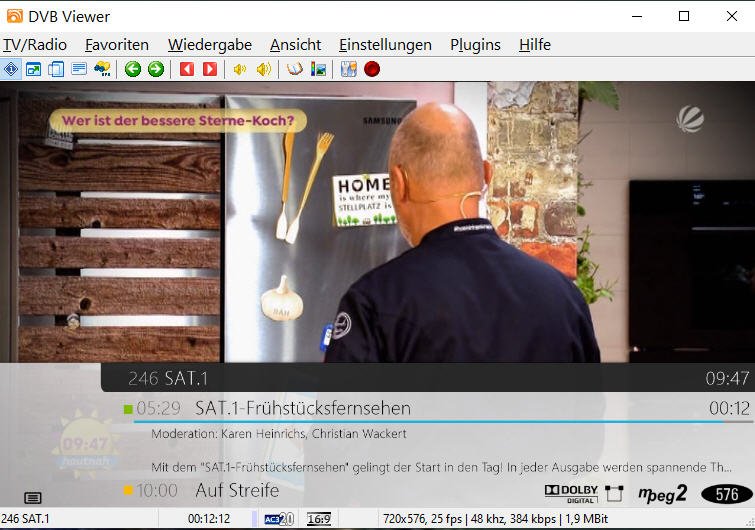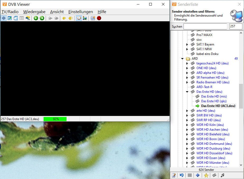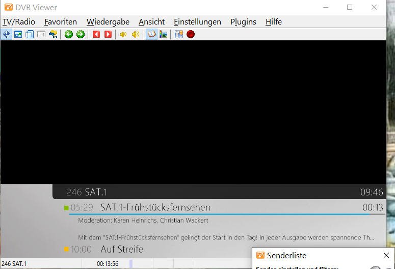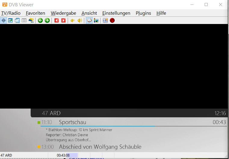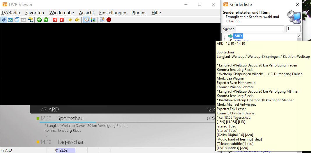 Hagen.Gtrube Posted January 4, 2024 Author Posted January 4, 2024 Danke für Deine Nachricht; ich habe die LAV Filter installiert und danach den PC frisch gestartet. Leider ist es noch genauso wie es zuvor war, aber noch ein wenig schlimmer. Ich wähle zu Beginn ZDF aus, das funktioniert prima. Ich möchte dann auf 3sat wechseln. Das ZDF Bild friert ein, die EPG Daten der 3sat Sendung erscheinen, aber es kommt kein Bild. (Bild 1) Anderes Beispiel: Ich starte DVBViewer frisch, gehe auf SAT1: alles ok. Dann Wähle ich ARD. Es kommen kurz die EPG daten (Bild2), diese verschwinden und der Bildschirm ist schwarz. Interessant ist, dass der Zeitzähler mitläuft (Bild 3). Starte ich den DVBViewer kommt ARD einwandfrei. Ich habe parallel den Task Manager laufen lassen. Beim Wechsel der Sender gibt es nur eine geringe Erhöhung der CPU Last für das Prograramm (ca 1%) Ich schicke die aktuelle support.zip mit dieser Nachricht. Danke für Ihre Hilfestellung. support.zip Quote